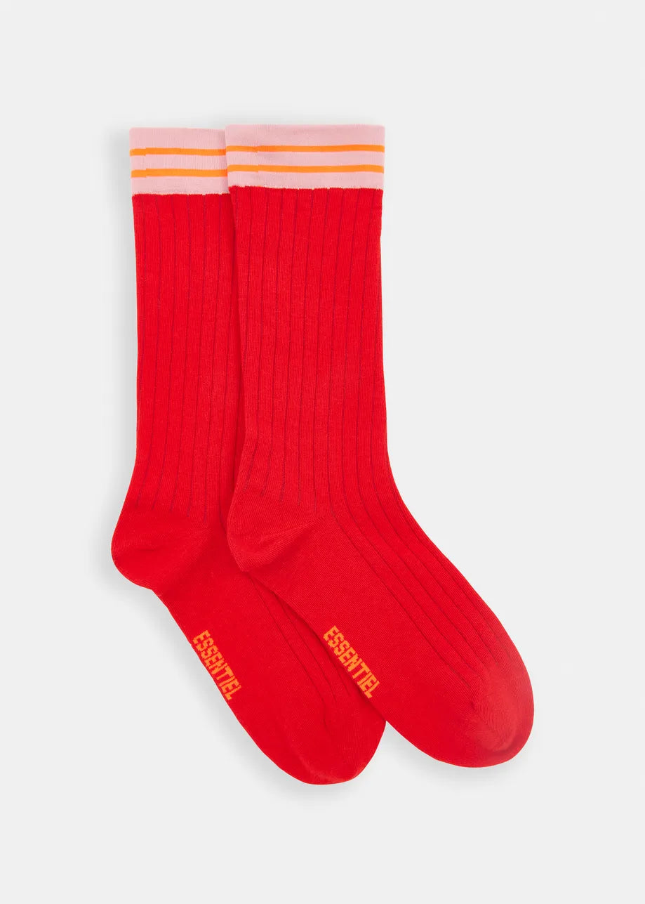 These rib-knit socks are crafted from a soft cotton blend and finished with bold side stripes for a sporty edge. Designed for everyday comfort with a touch of style, they look especially chic pulled up over leggings or styled with sneakers to show off the graphic detail.