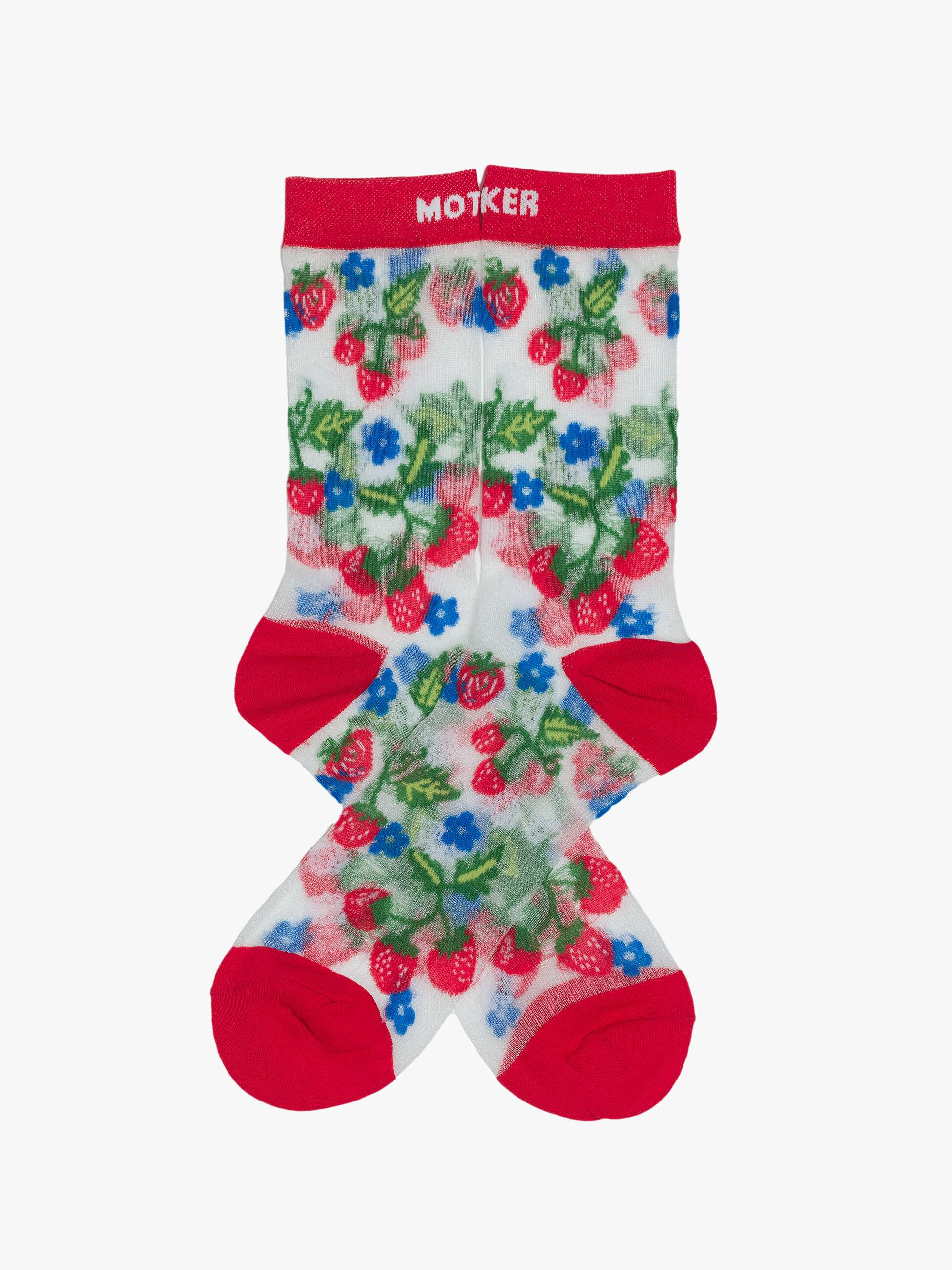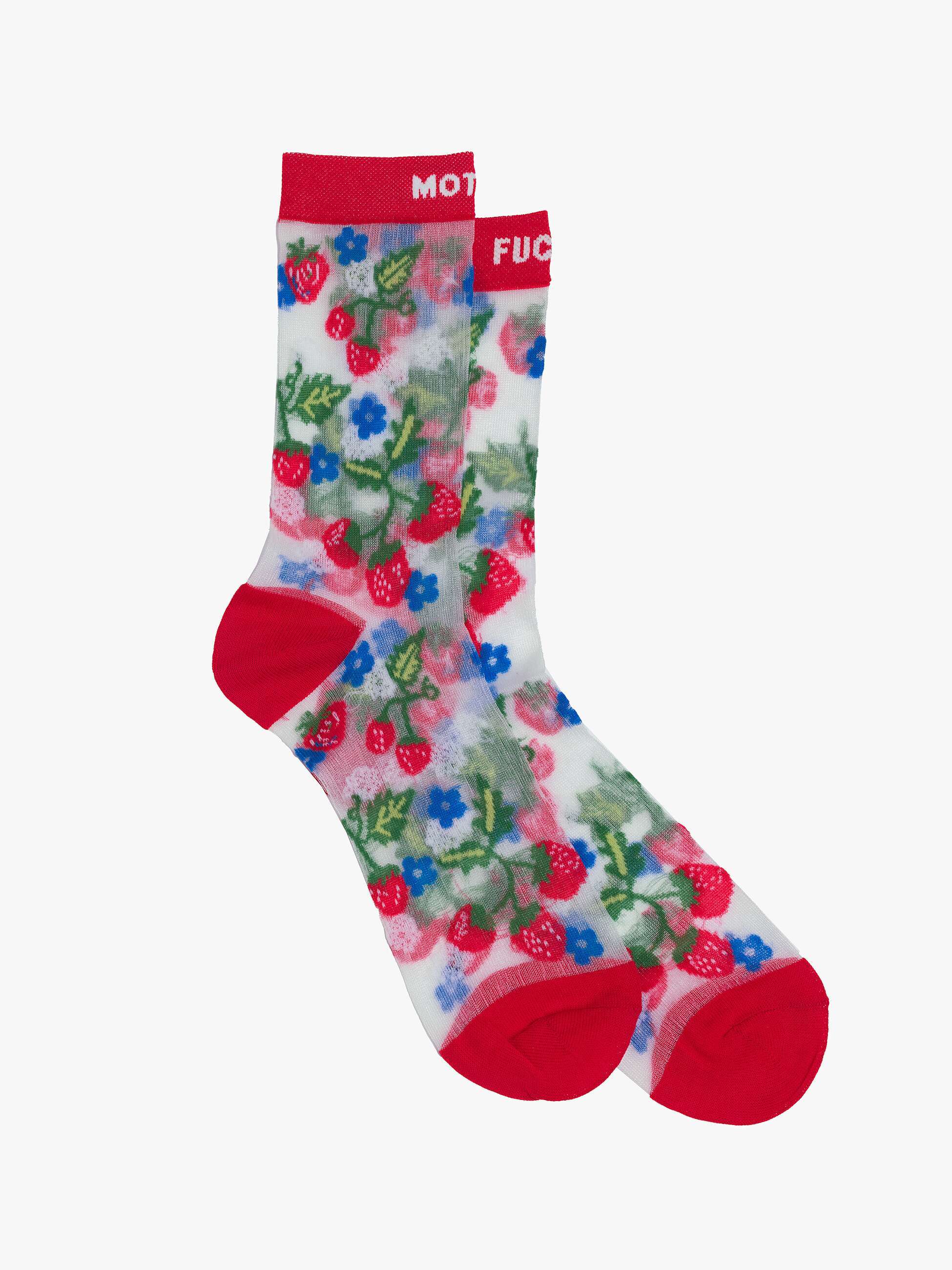 Ripe for the picking. These classic tube socks deliver MOTHER’s signature attitude with a bold message. Designed in a sheer grey fabric, they feature playful strawberry and flower graphics, red trim, and crisp white lettering for a cheeky finishing touch.