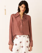 A timeless wardrobe essential with a touch of vintage charm. This silky button-down shirt features a dramatic pointed collar and relaxed silhouette, lending effortless sophistication to any ensemble. Designed with mother-of-pearl buttons and elongated cuffs, it offers a modern twist on classic tailoring. The fluid drape of the hand-dyed silk in a rich rosewood hue makes this blouse a versatile staple—from elevated everyday looks to evening polish. Wear it tucked or untucked to suit your mood.