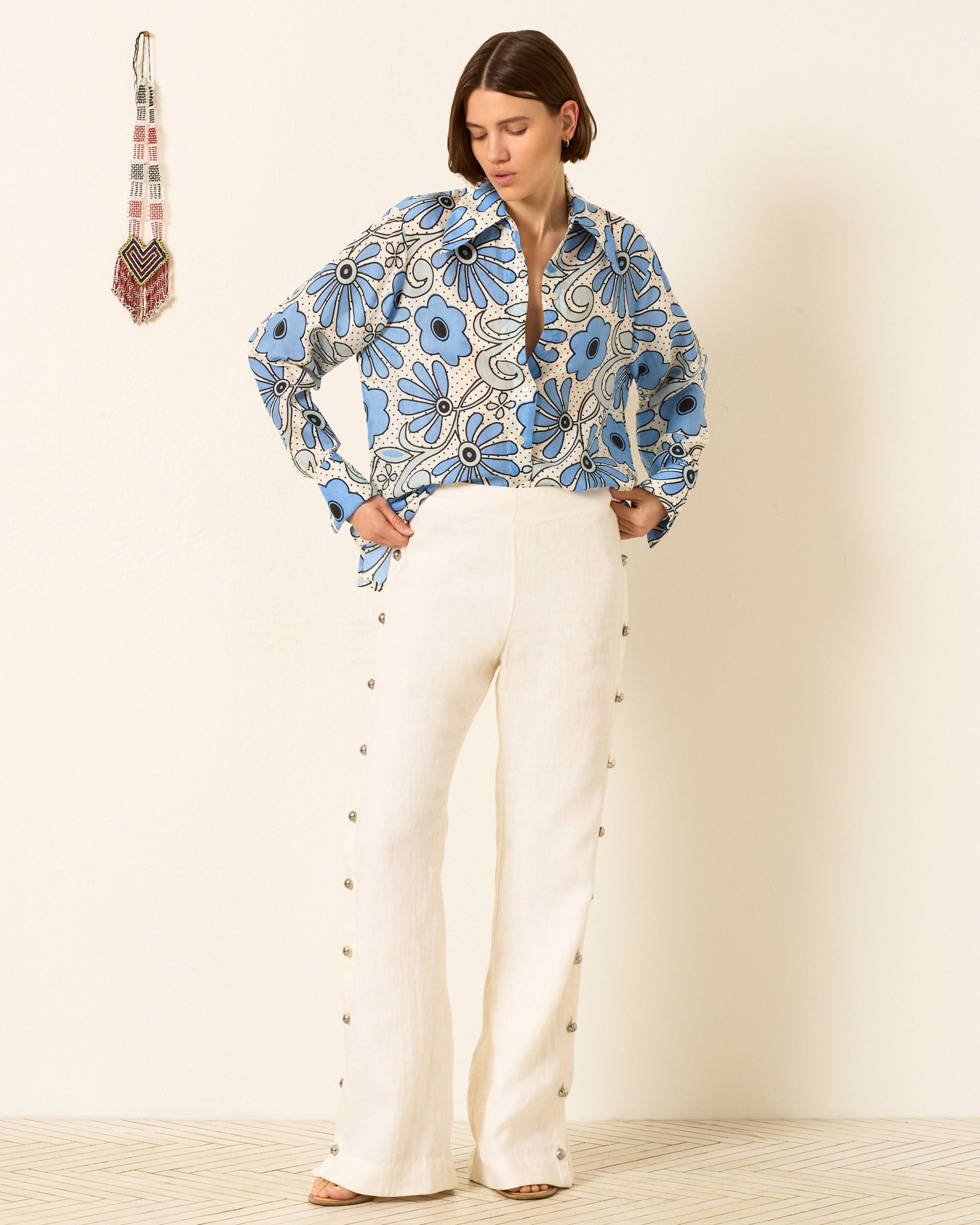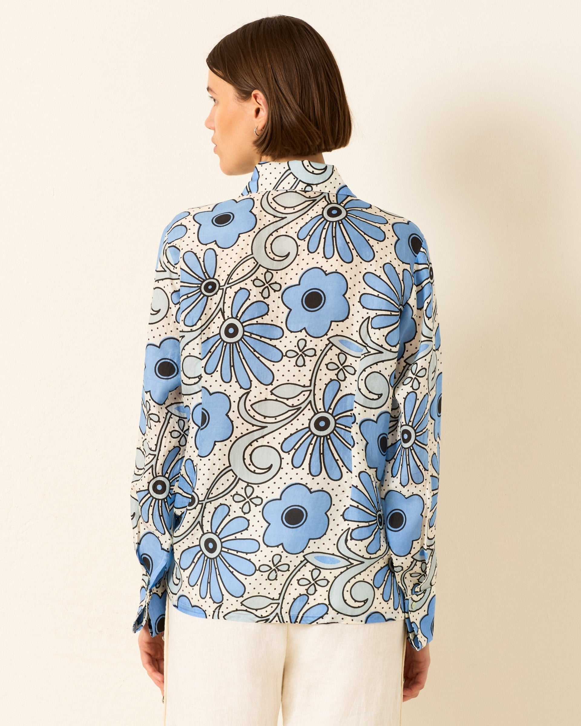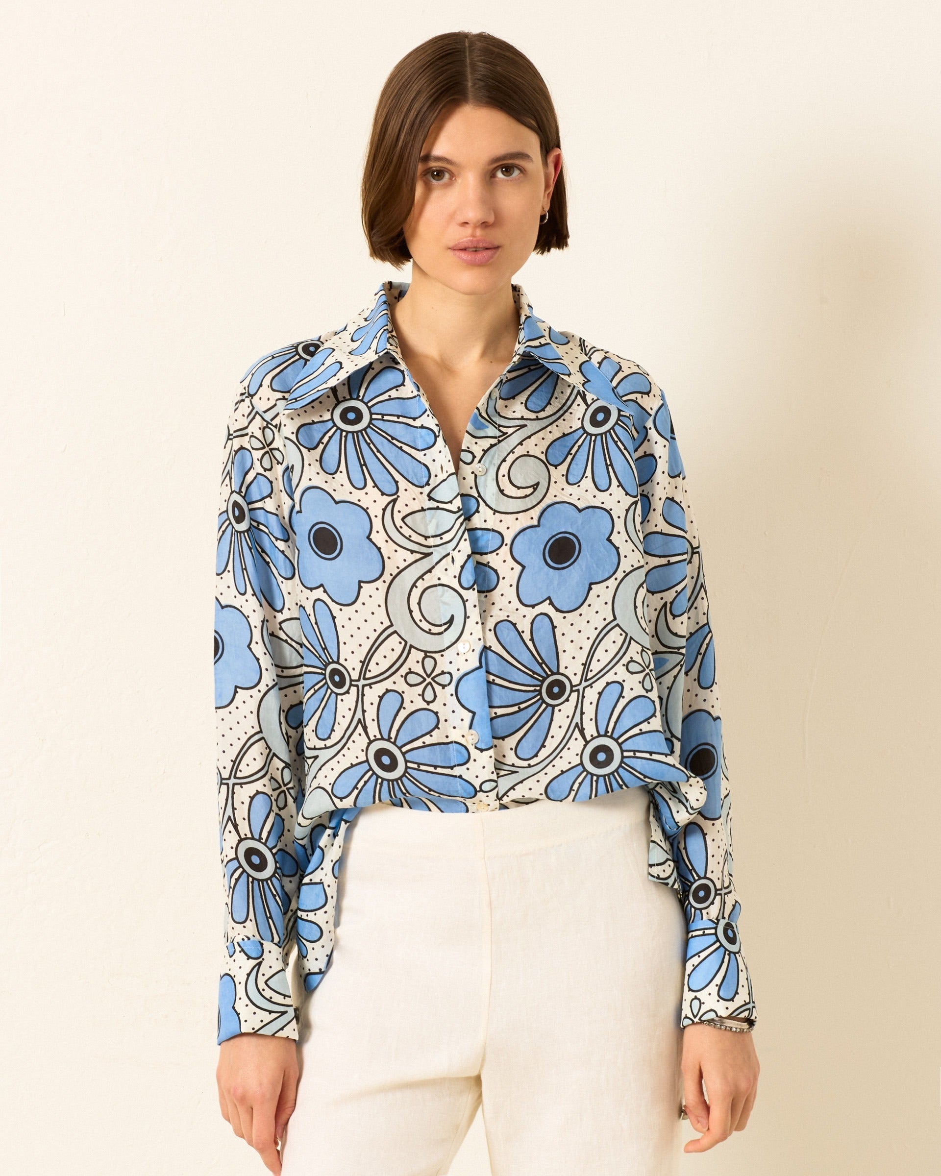 Crafted from hand-loomed silk, this floral shirt features a vintage-inspired motif drawn from a French antique textile. Designed with a sharp dagger collar, mother-of-pearl button front, and bold French cuffs, it offers versatile styling—wear the cuffs loose for ease or fasten with cufflinks for a refined finish.
