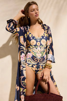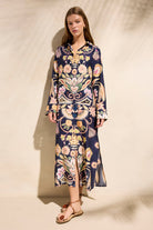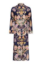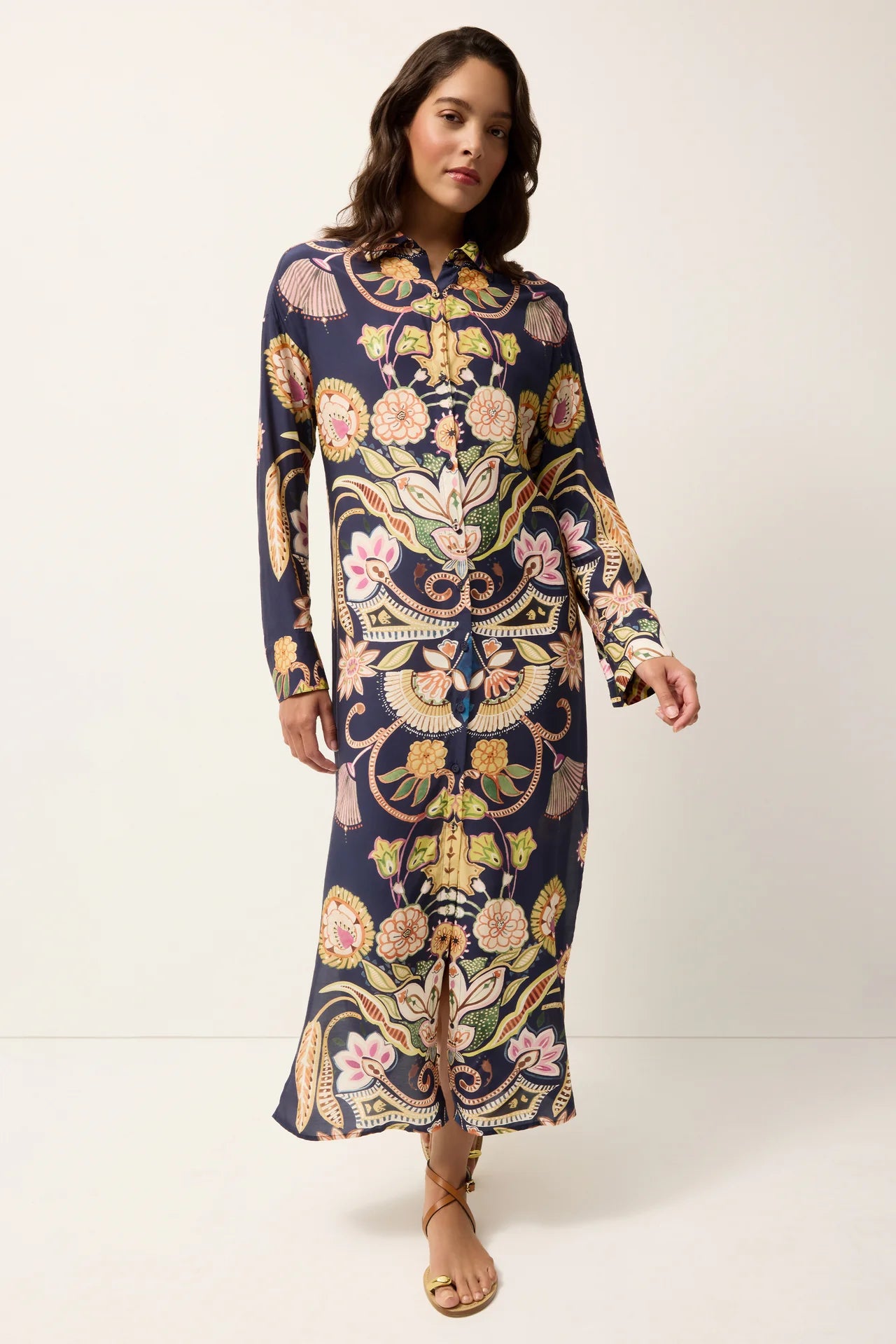 Marnie’s oversized silhouette strikes a confident balance between effortless ease and maximalist style. A relaxed take on the classic shirtdress, it showcases an allover print that sets the stage for Neptune—an abstract floral motif layered over a sun-faded navy ground. Bold yet wearable, it’s designed to make an impact with minimal effort.