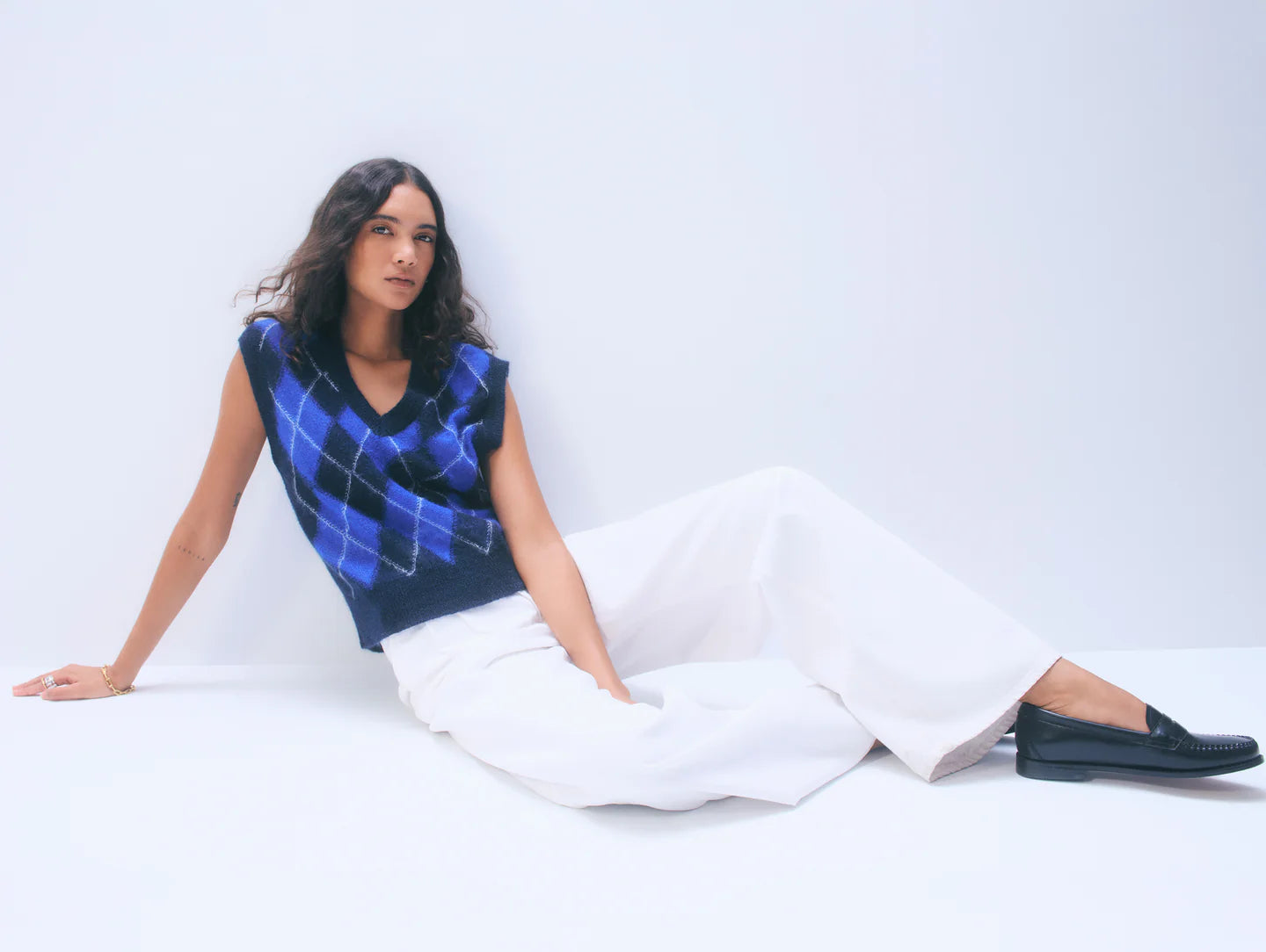 A true seasonal standout, this featherlight vest is crafted from cruelty-free mohair for a soft, airy feel. It showcases a subtly blurred argyle pattern with rich texture, adding depth and dimension to any look. Easy to layer over button-downs, tees, or dresses, it brings a refined yet cozy touch to transitional styling.