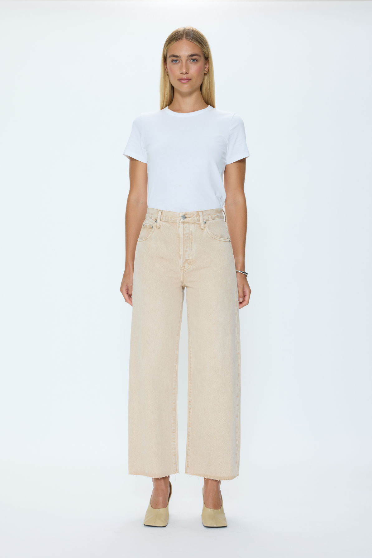 Tate sits at a flattering high rise with a signature bowed wide-leg silhouette and a full-length 32" inseam that creates architectural drama. A subtle curve through the leg adds dimension, while the wide opening delivers modern proportion to any look. Crafted from 100% cotton non-stretch denim, it holds its shape beautifully for a refined, structured finish.