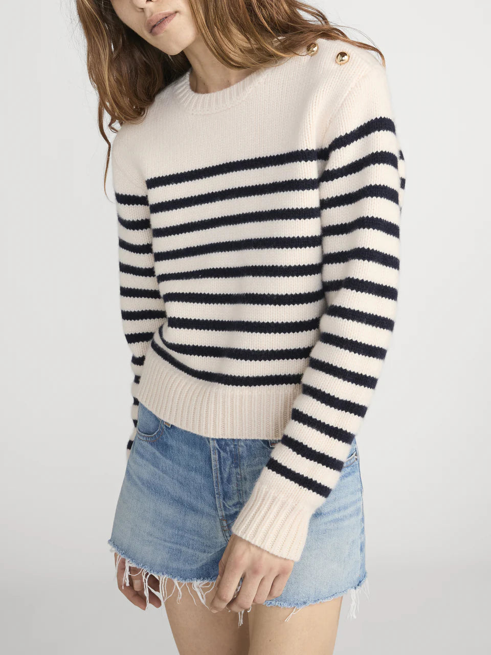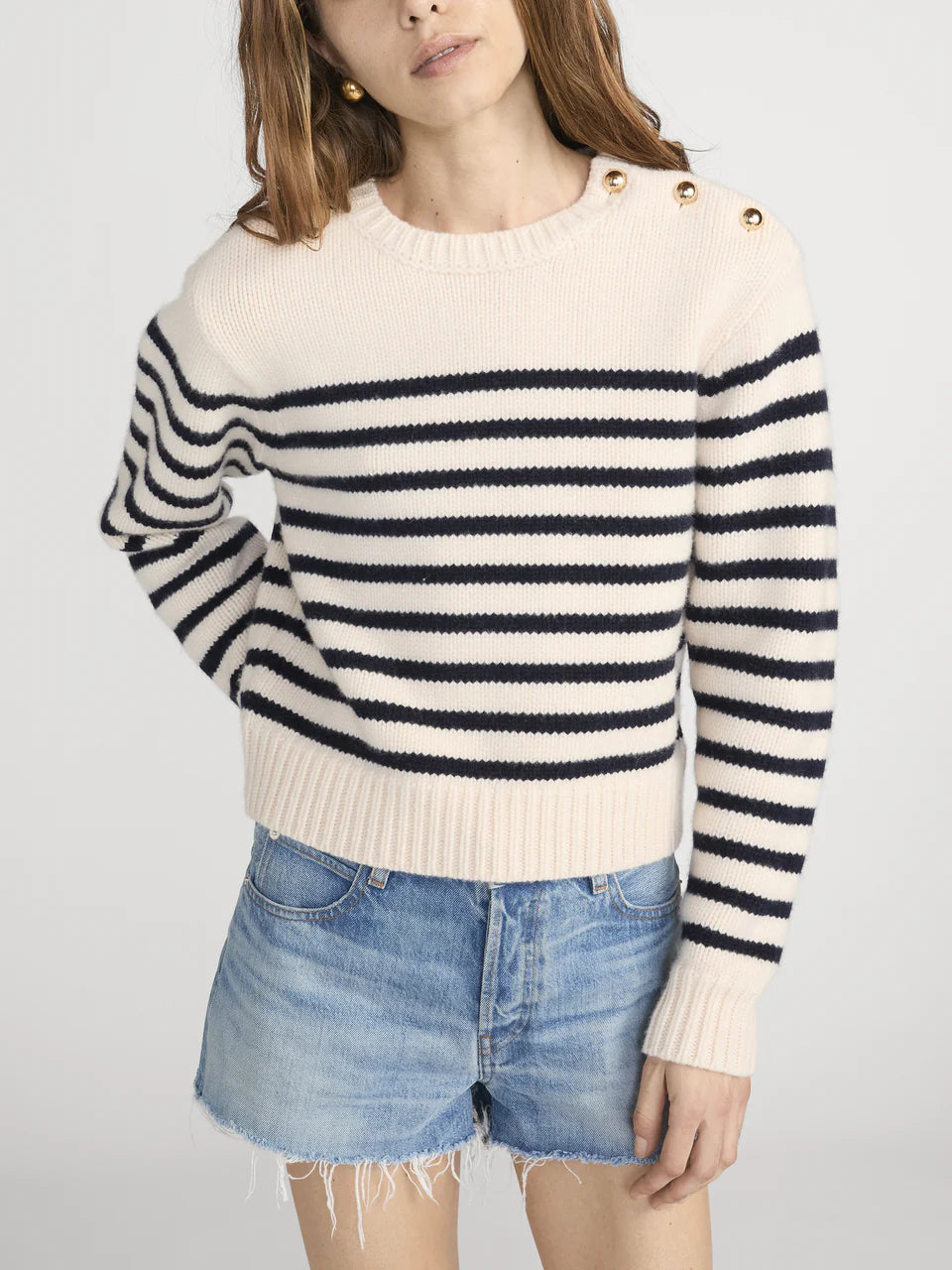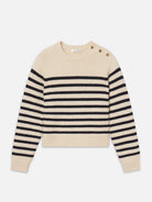 The Mariner Sweater is knit from soft, plush 100% wool and designed with a slightly cropped silhouette for a modern, flattering fit. Functional gold buttons at the shoulder add a subtle nautical-inspired detail, giving this classic knit a polished, elevated finish.
