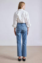 - Rigid fabric, ultra high rise, slim fit, forward side seam, slight kick flare, front scoop pockets, coin pocket, back patch pockets, zipper closure, belt loops
