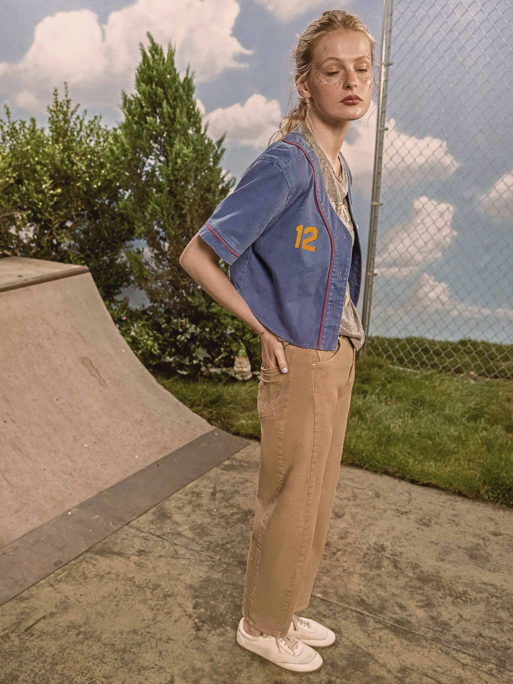 A ultra high-waisted jean featuring a wide, curved leg, a 28.25-inch inseam, and a clean hem for a sleek finish. Crafted from semi-rigid SUPERIOR denim, the Curds And Whey wash comes in a soft khaki hue. Designed to mold to your shape over time, these jeans require a little patience to break in—because good things are worth the wait. Proudly made in Los Angeles.