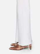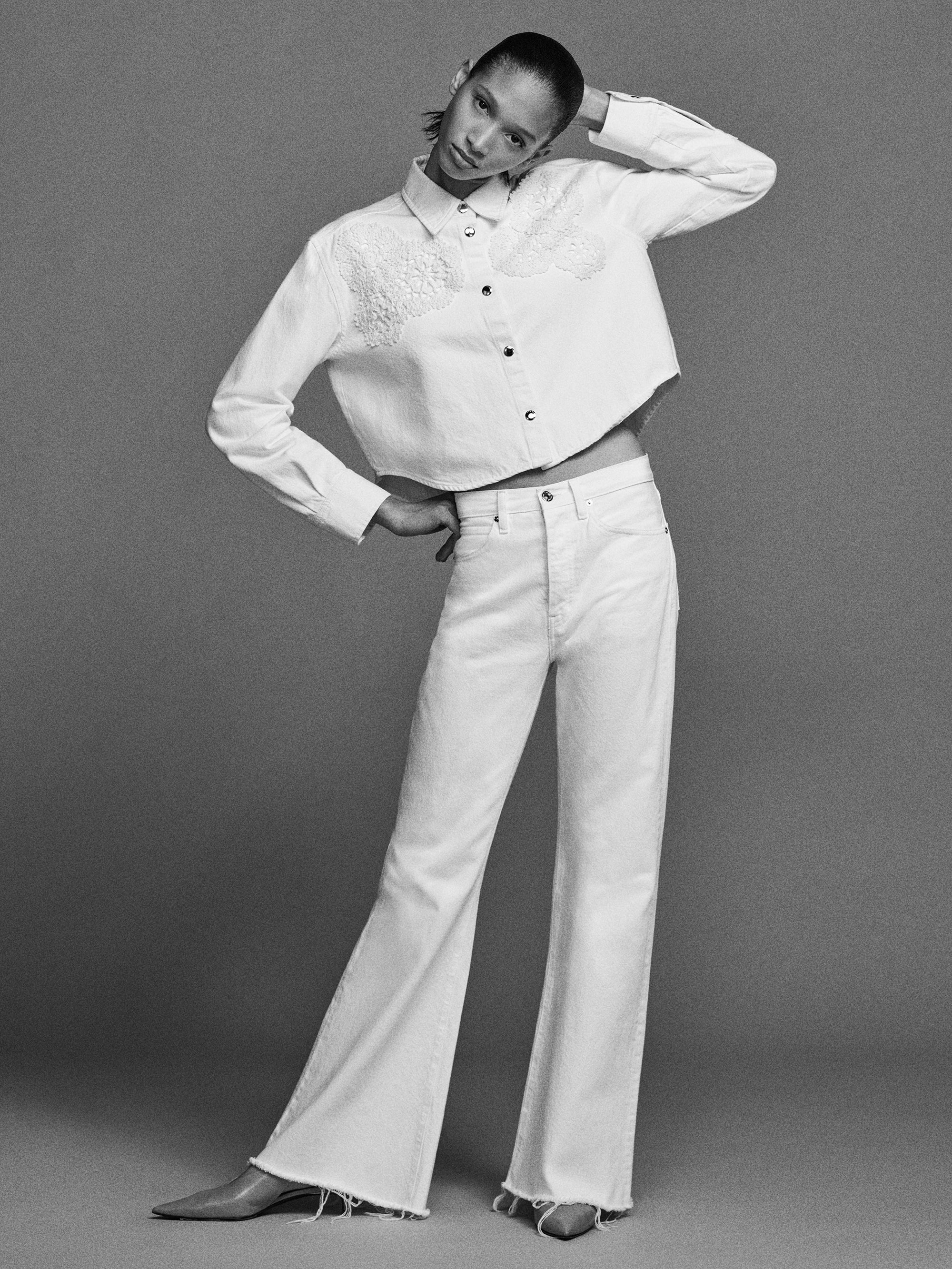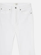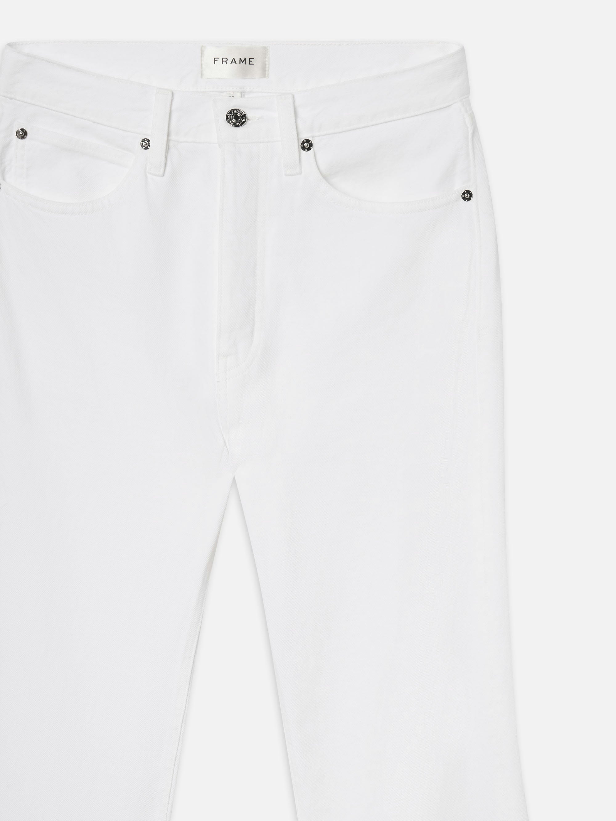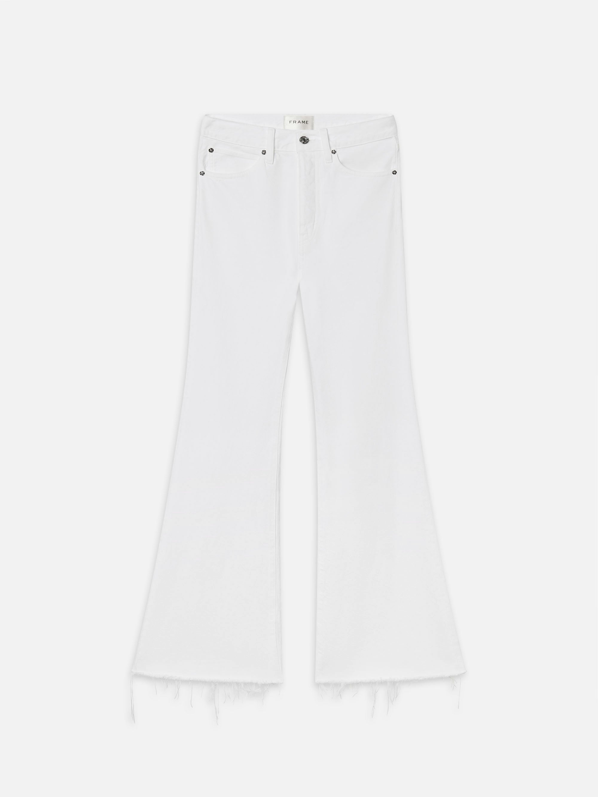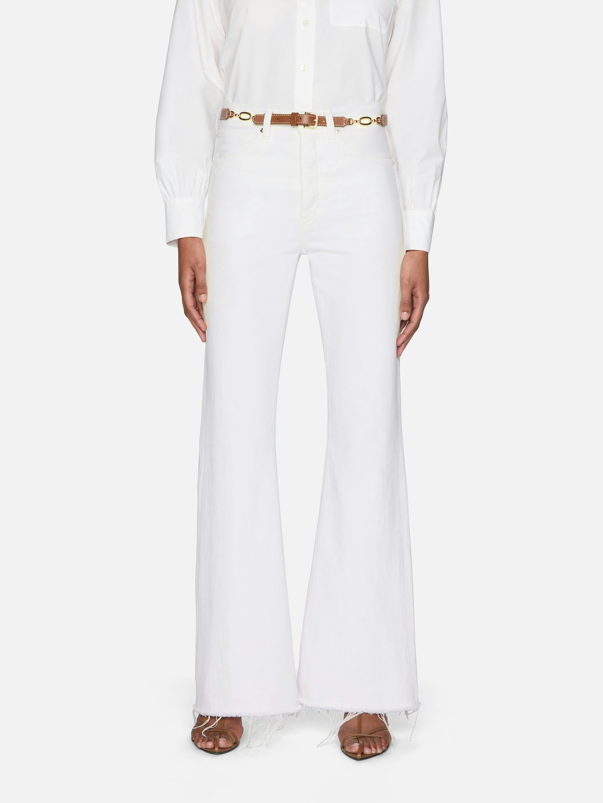 For the effortlessly cool LA vibe, these white jeans sit just above the hip and flow into a relaxed, wide-leg flare. The roomy fit is crafted from rigid denim for added structure, while the raw, frayed hem gives them an authentic vintage touch. Perfect for a laid-back yet stylish look.