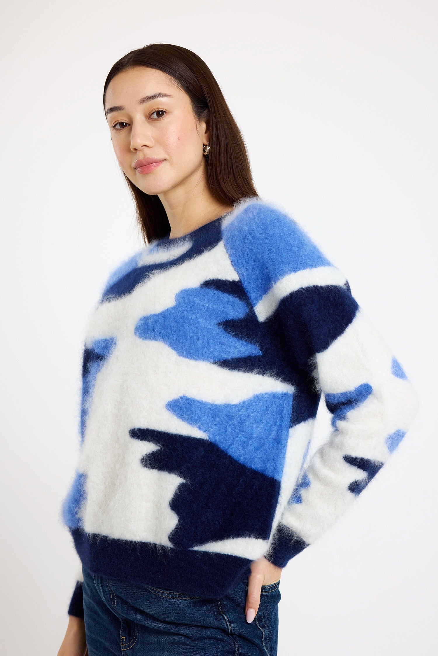 Brodie Brushed Cashmere Camo Sweater in Navy/Jasmine, Benzo, Cosmos