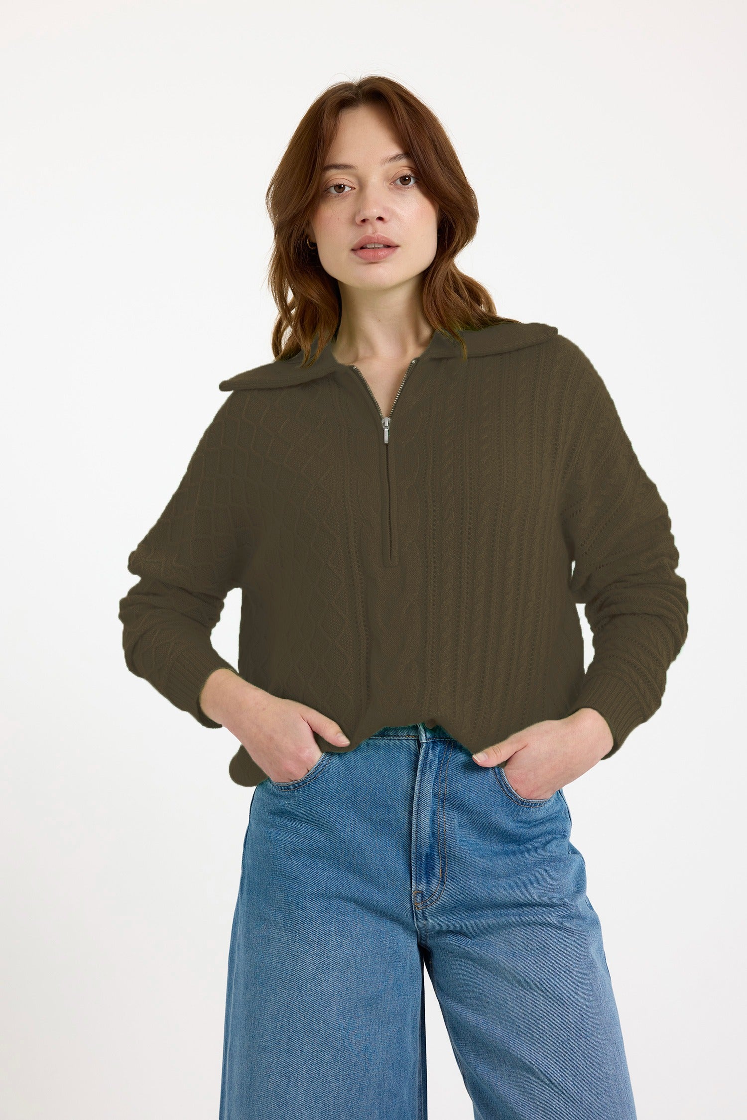 Mixed Cable Half Zip in Olive