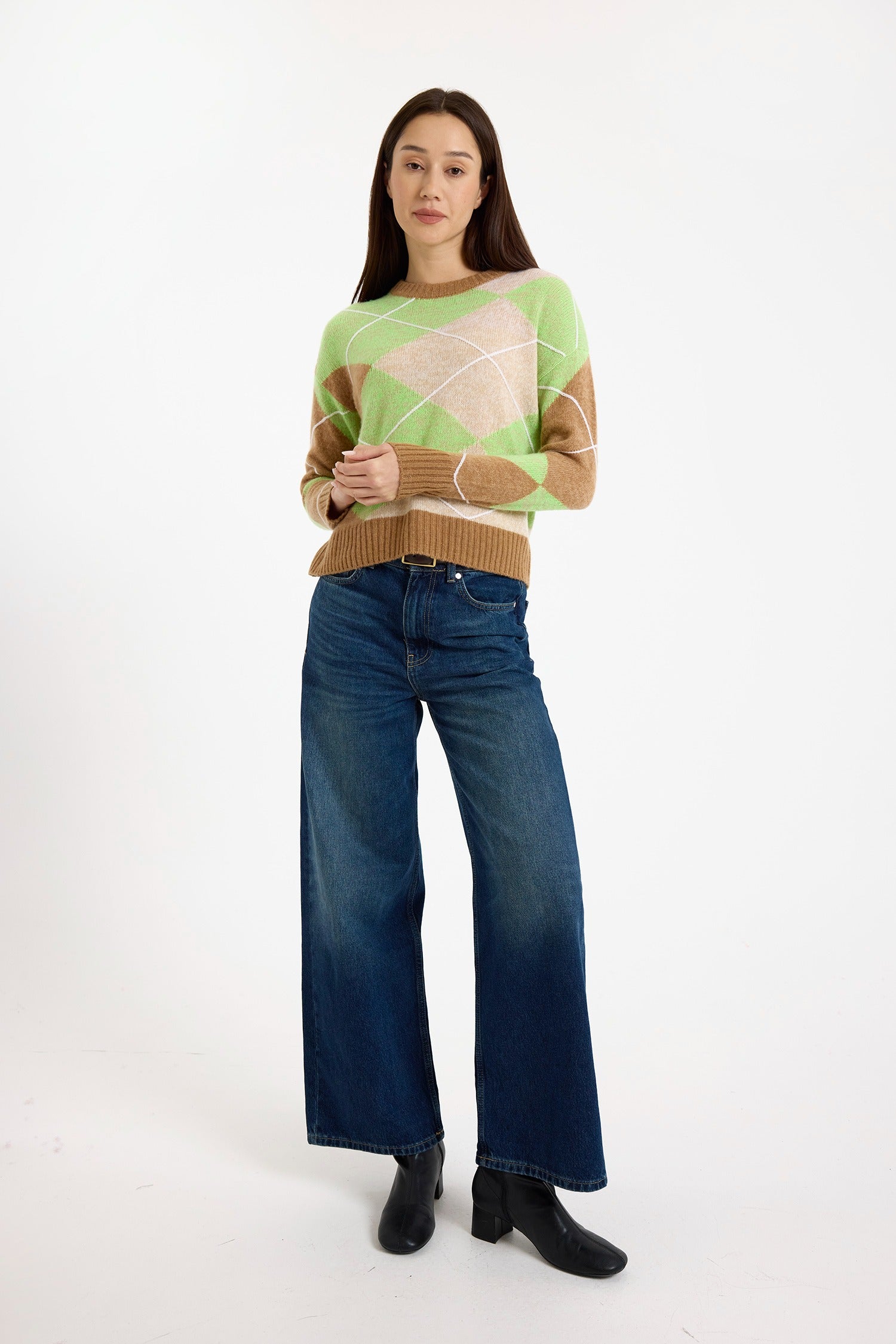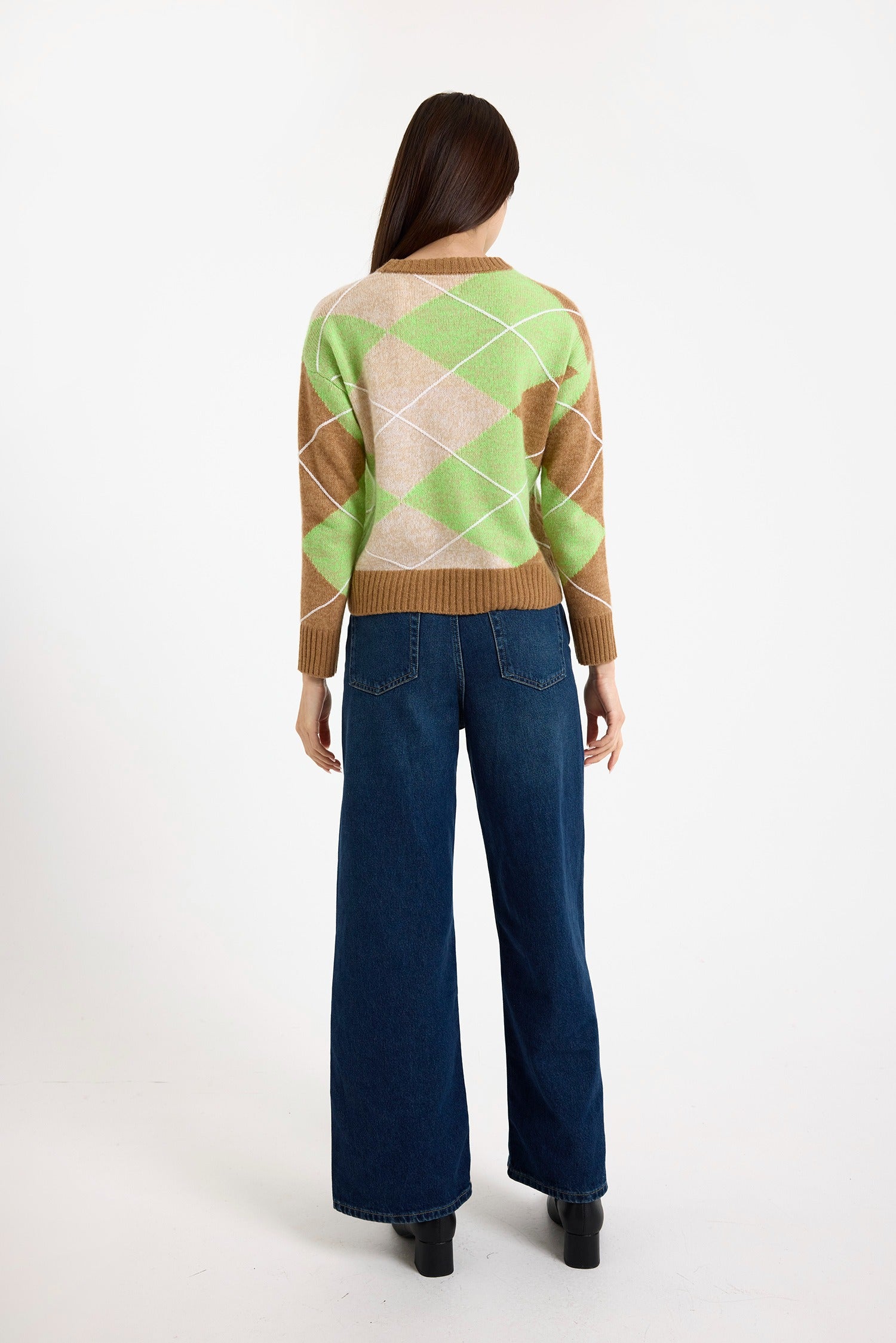 Argyle Cashmere Crew in Chestnut/Electric Lime