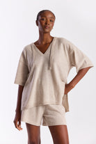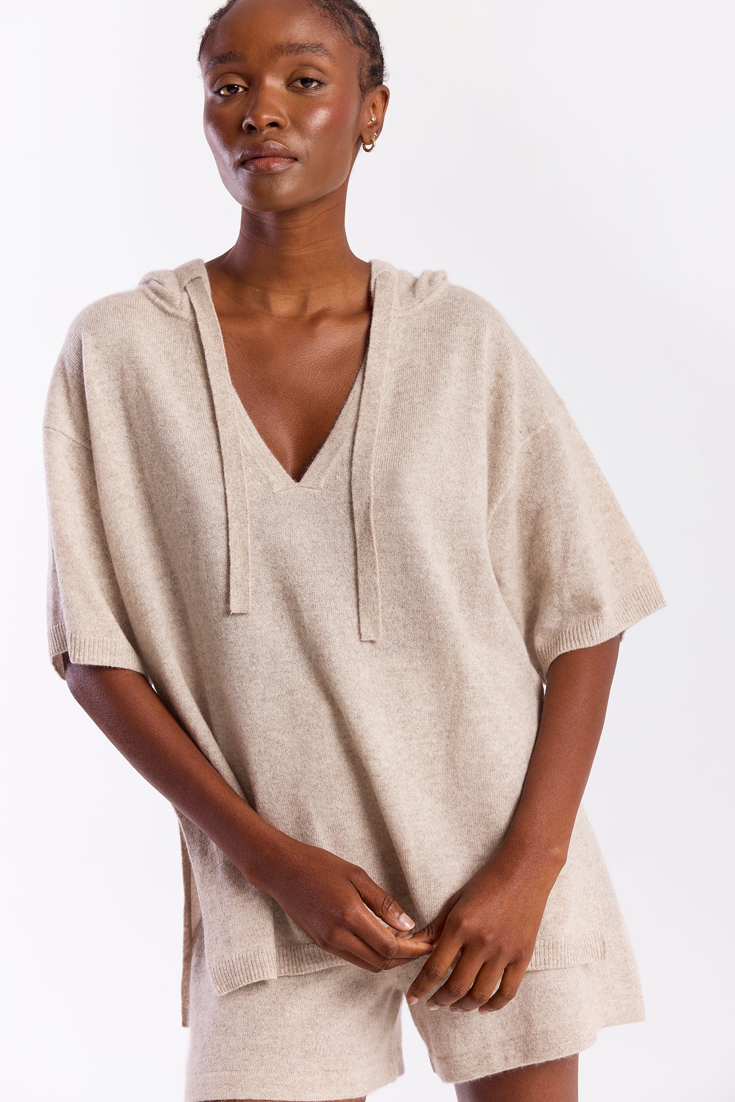 The Solid Aura Hooded Tee combines laid-back comfort with an elevated knit feel, offering a relaxed silhouette that’s perfect for everyday wear. Designed with a soft V-neckline, attached hood with drawstring detail, and elbow-length sleeves, this lightweight knit drapes effortlessly for a modern, easy fit. The neutral tone makes it endlessly versatile, whether styled with the coordinating shorts for a polished set or paired with denim and sandals for an understated, off-duty look. Pair it with the Bermuda Shorts in Wheat.
