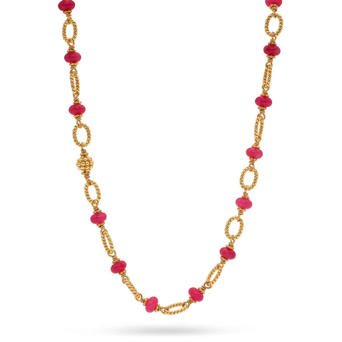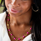 For those moments when only a hint of color will do, we’ve added semi-precious beads to a classic chain necklace, creating a subtle splash of elegance. Incredibly versatile, this piece doubles as a bracelet when wrapped around the wrist three times, transforms into a chic lariat style, is perfect for layering, and can even hold a pendant. Like all women, this necklace is a beautiful multi-tasking gem.