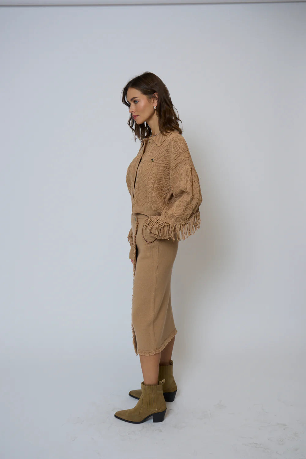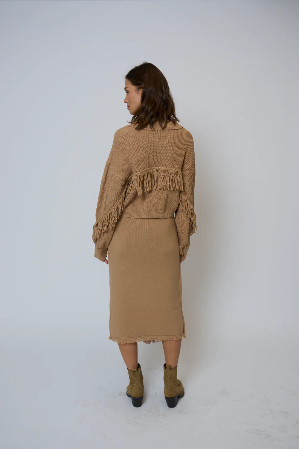 Elyse Fringe Asymmetrical Midi Skirt in Camel