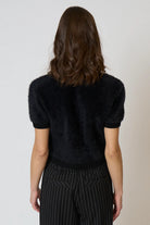 Made from a luxe plush knit with a soft-touch finish, this sweater brings elevated comfort to everyday dressing. Ribbed trim at the neckline, cuffs, and hem adds a polished touch, while the slightly cropped fit makes it perfect for layering with high-waisted bottoms. Short sleeves with a subtle structured shape give it a modern, versatile edge.