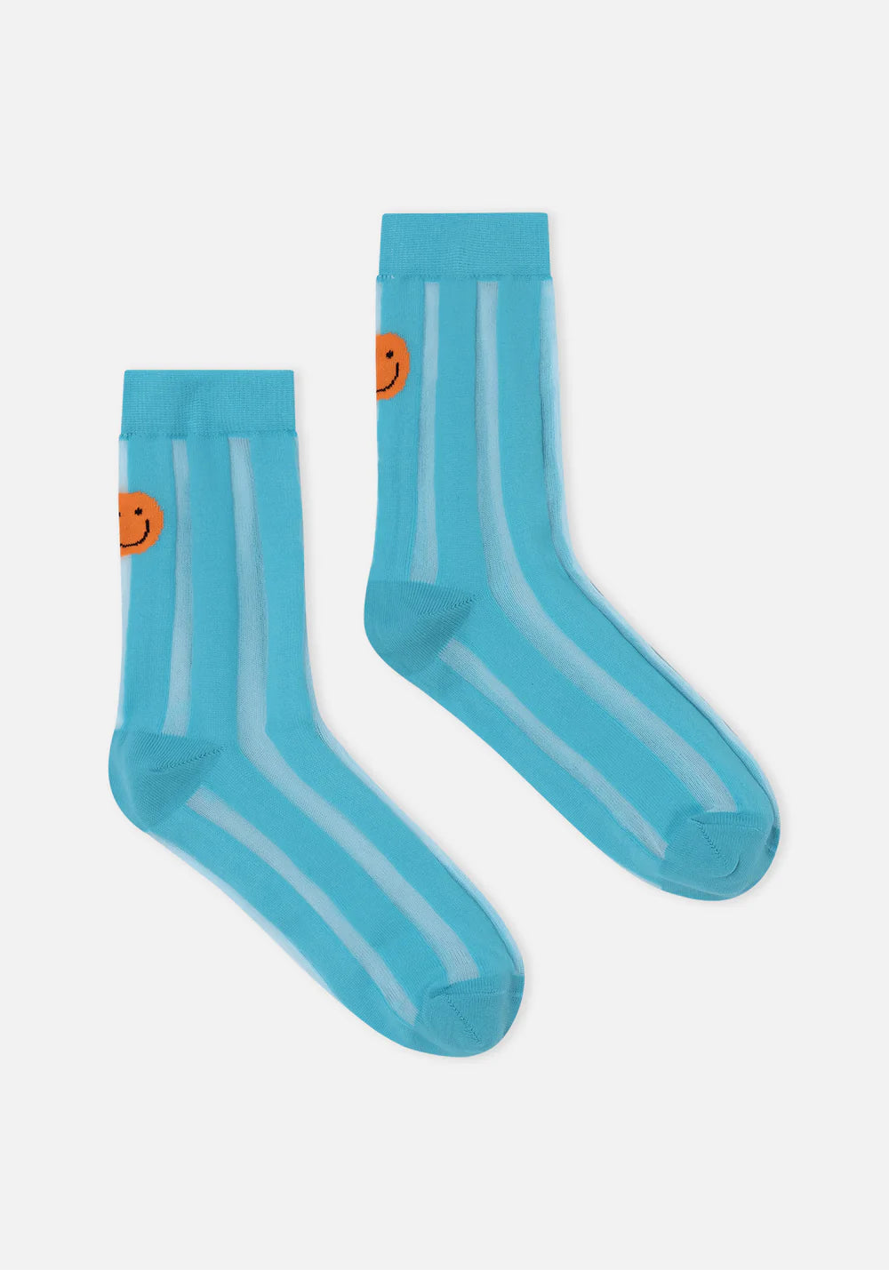 Sheer neon turquoise striped socks with a fun neon orange smiley detail at the back.