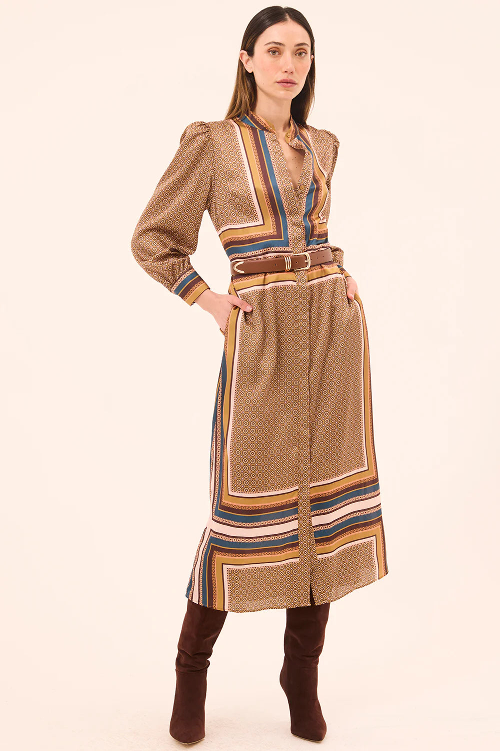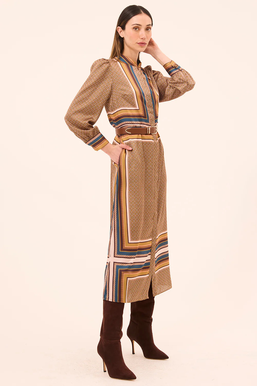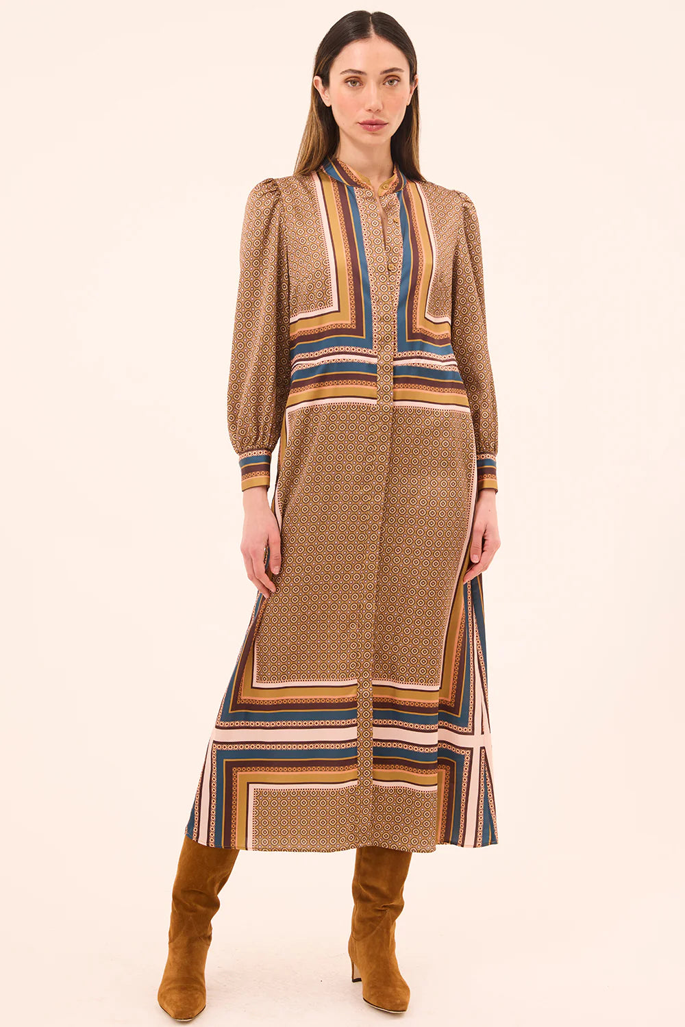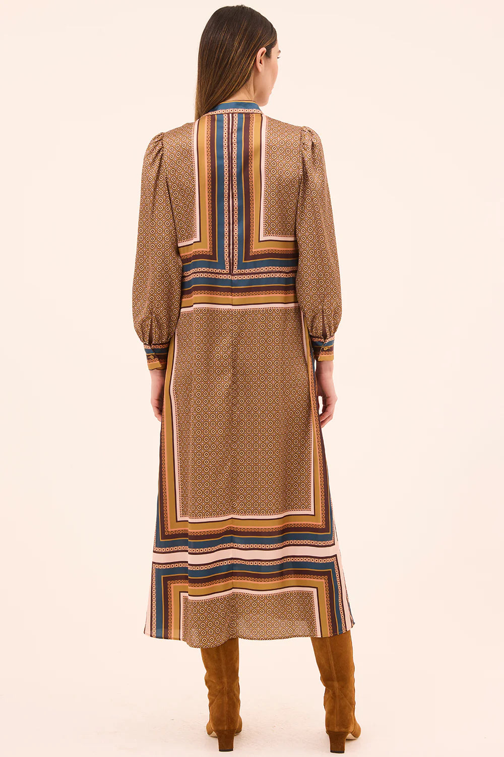 Martha Dress in Tan/Slate Blue/Burnt Umber