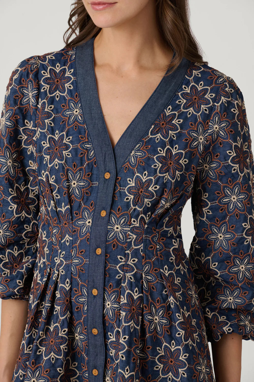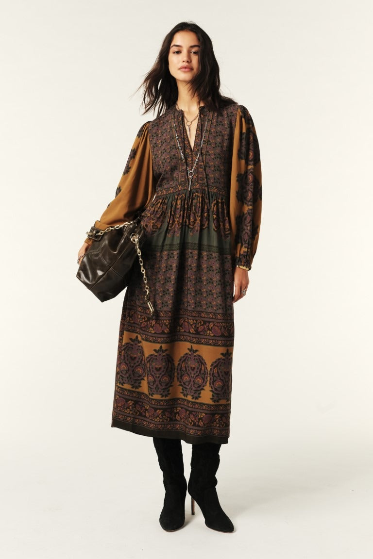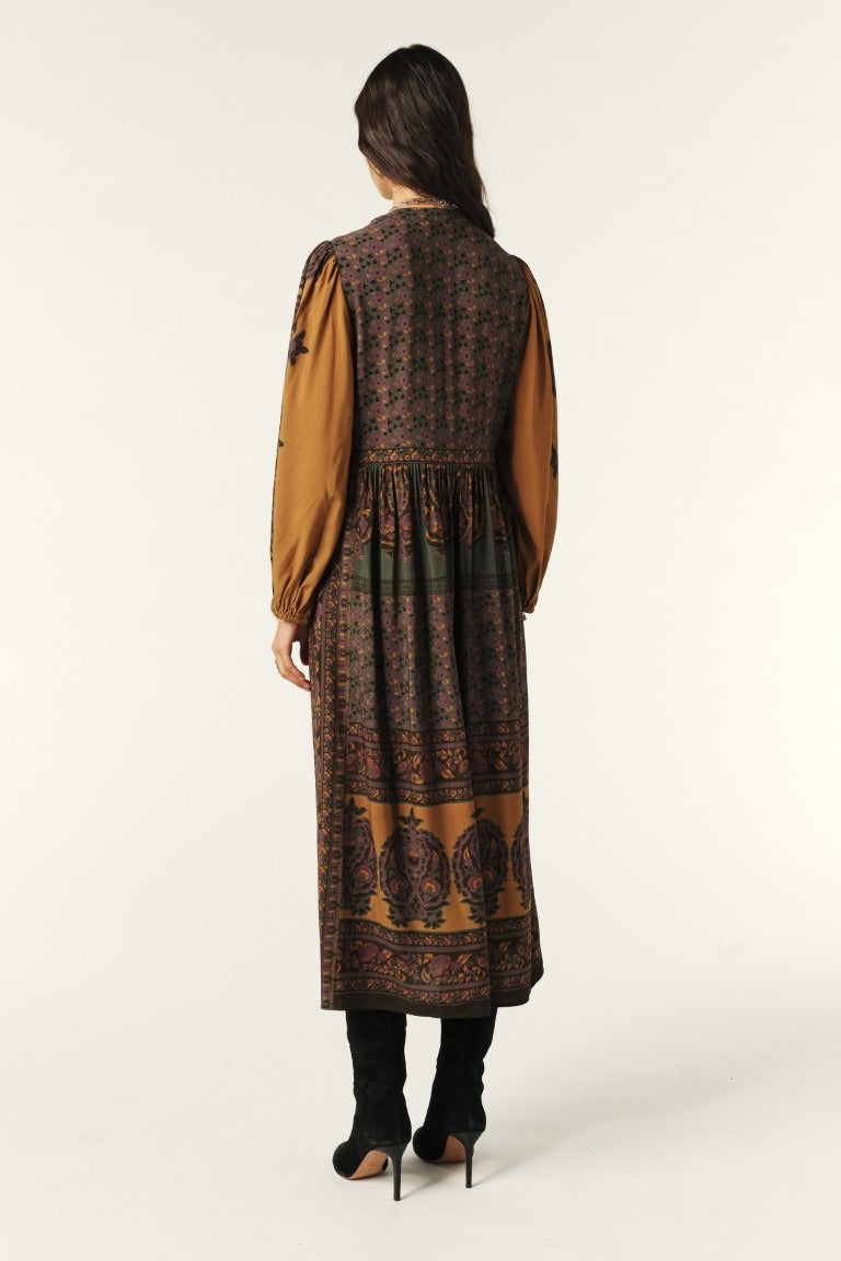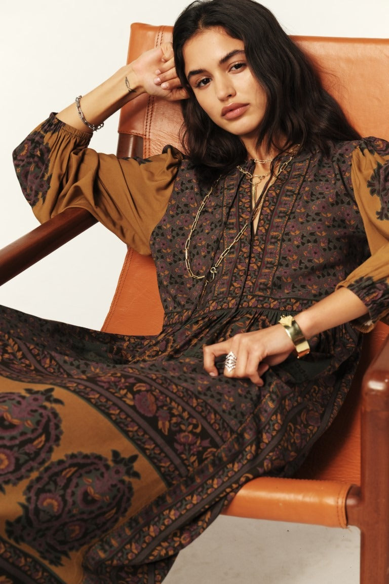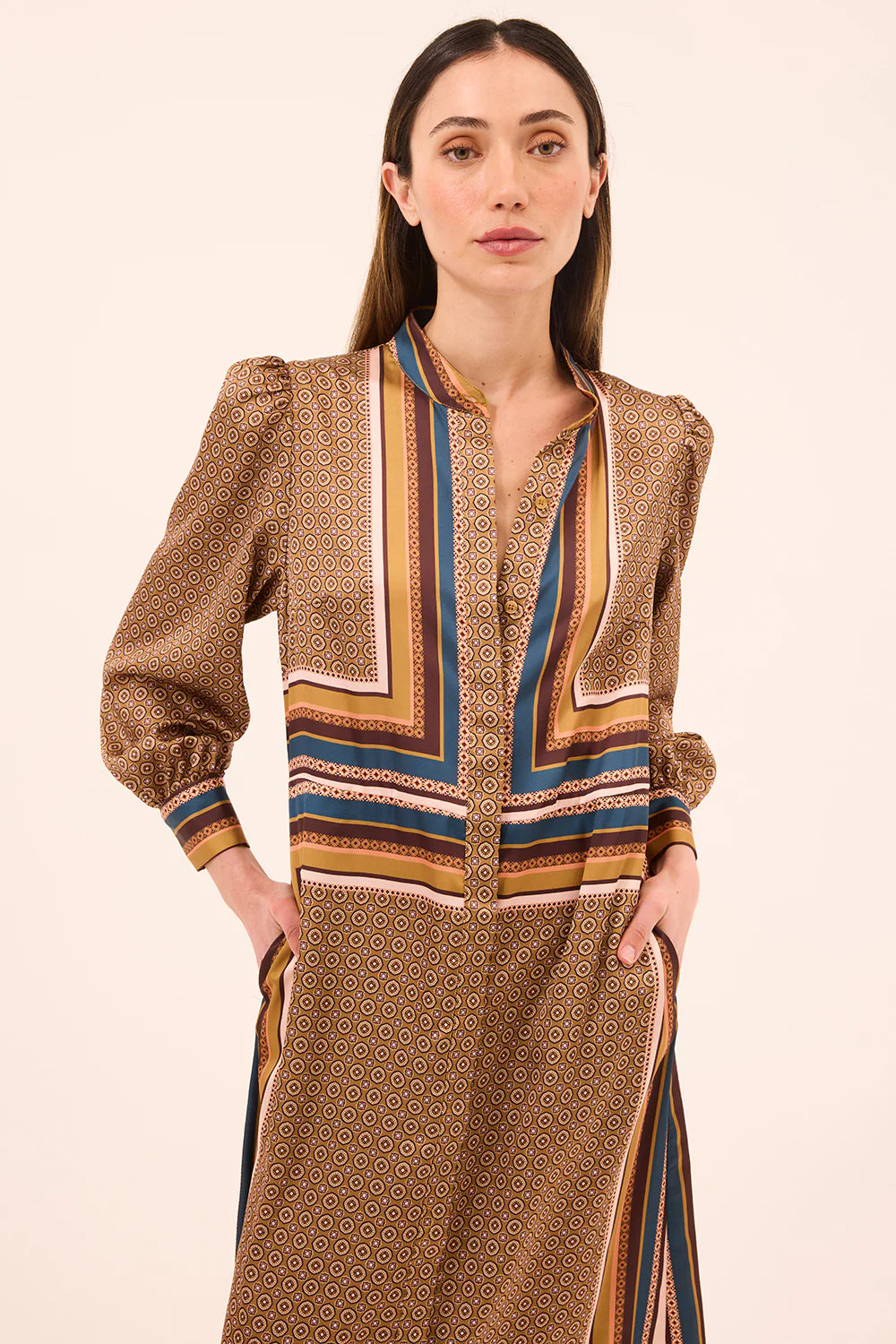 Martha Dress in Tan/Slate Blue/Burnt Umber