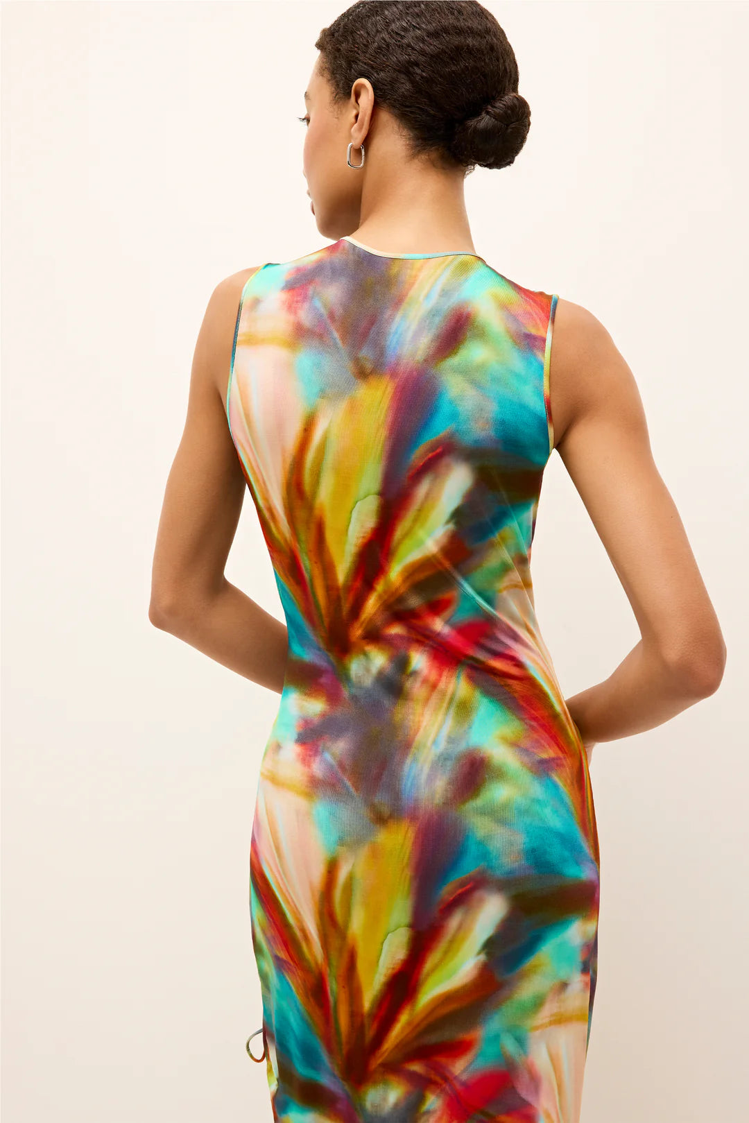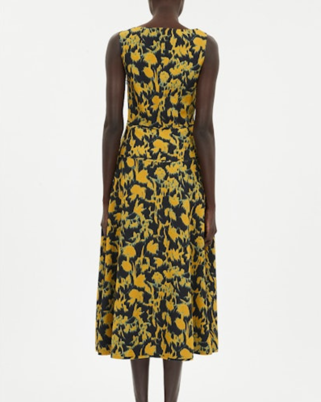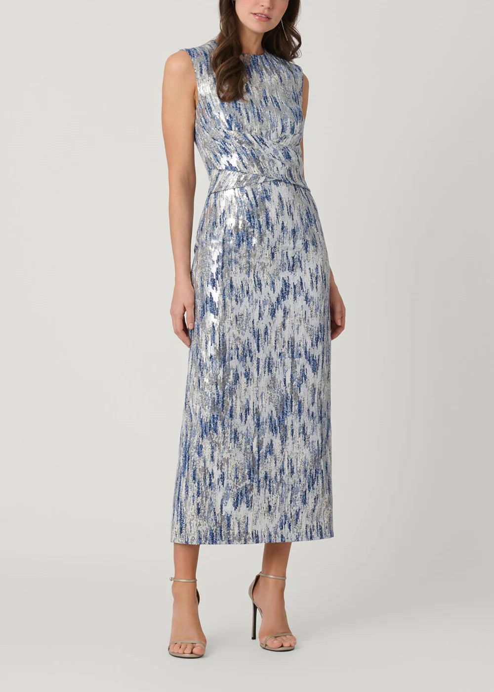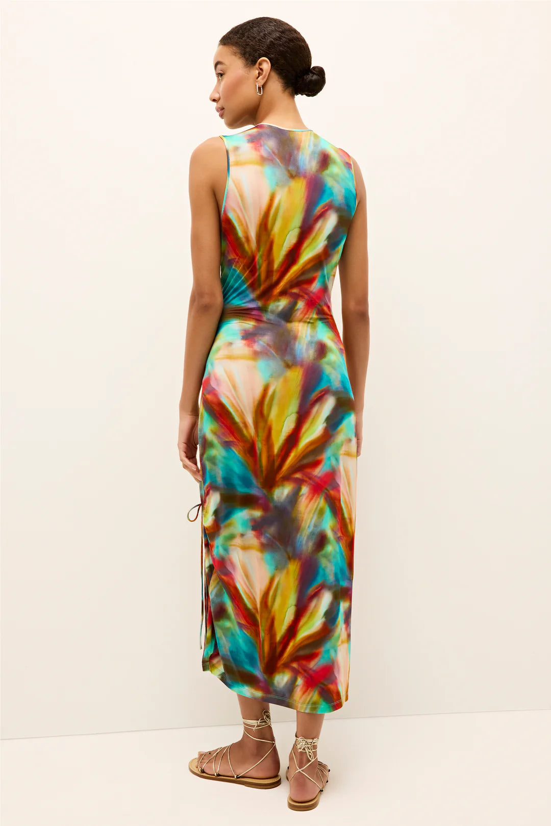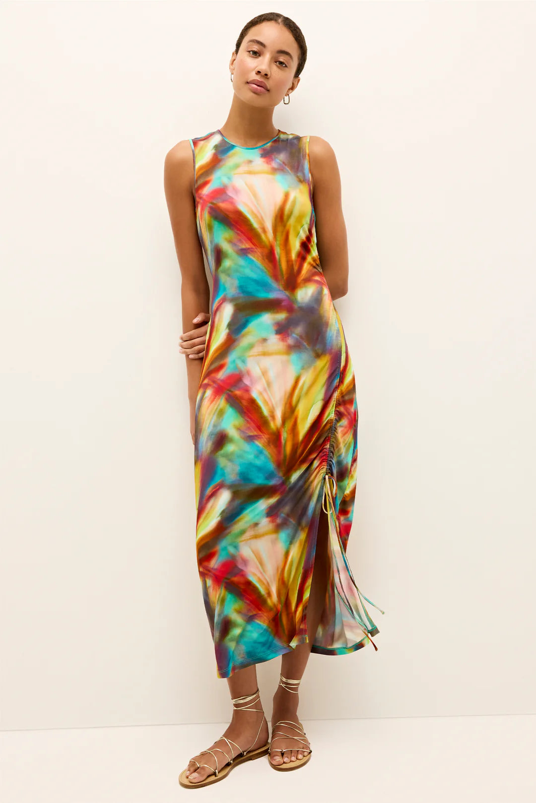 Demetria Sleeveless Ruched Front Midi Dress in Gold Leaf