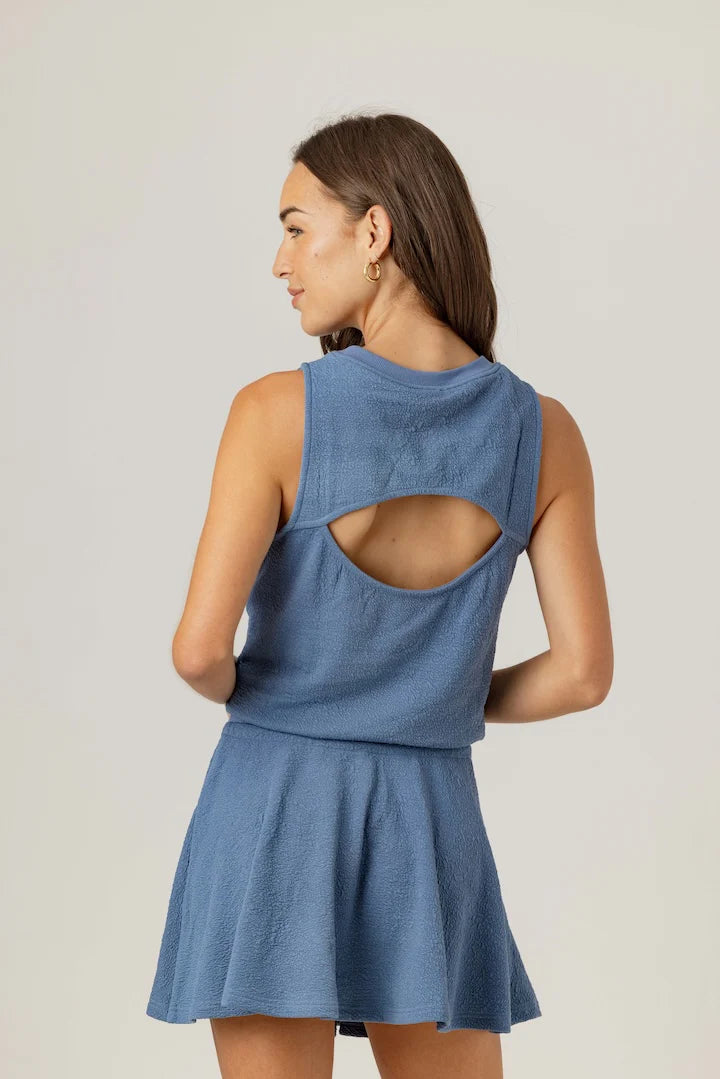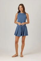The Amory Dress offers a relaxed fit with a drawcord waist that lets you customize the look—wear it higher for a defined shape or lower for a casual, drop-waist vibe. An open back adds a breezy, airy feel while staying bra-friendly. Falling to mid-thigh on most wearers, this effortlessly flattering dress features a classic crew neckline and is perfect for easy, versatile summer style.