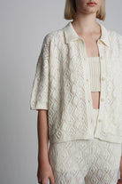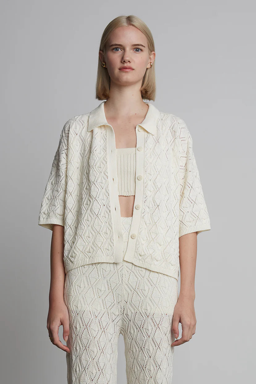 The Gia Shirt is effortlessly chic with its modern lace stitch, offering a feminine yet relaxed feel. Layer it over the Pearla Crop Top for a breezy, textured look, or wear it solo for an airy, sophisticated vibe. For the ultimate head-to-toe knit ensemble, pair it with the matching Amelia Pant—perfect for poolside lounging, beach days, or sunset cocktails.