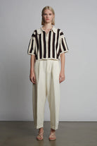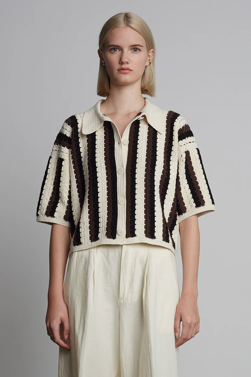 The Lila Crochet Shirt is crafted in a hand-crocheted vertical-striped pattern with elbow-length sleeves, making it a versatile statement piece. Whether worn casually or dressed up, solo or layered, Lila can adapt to any styling mood.