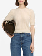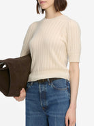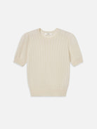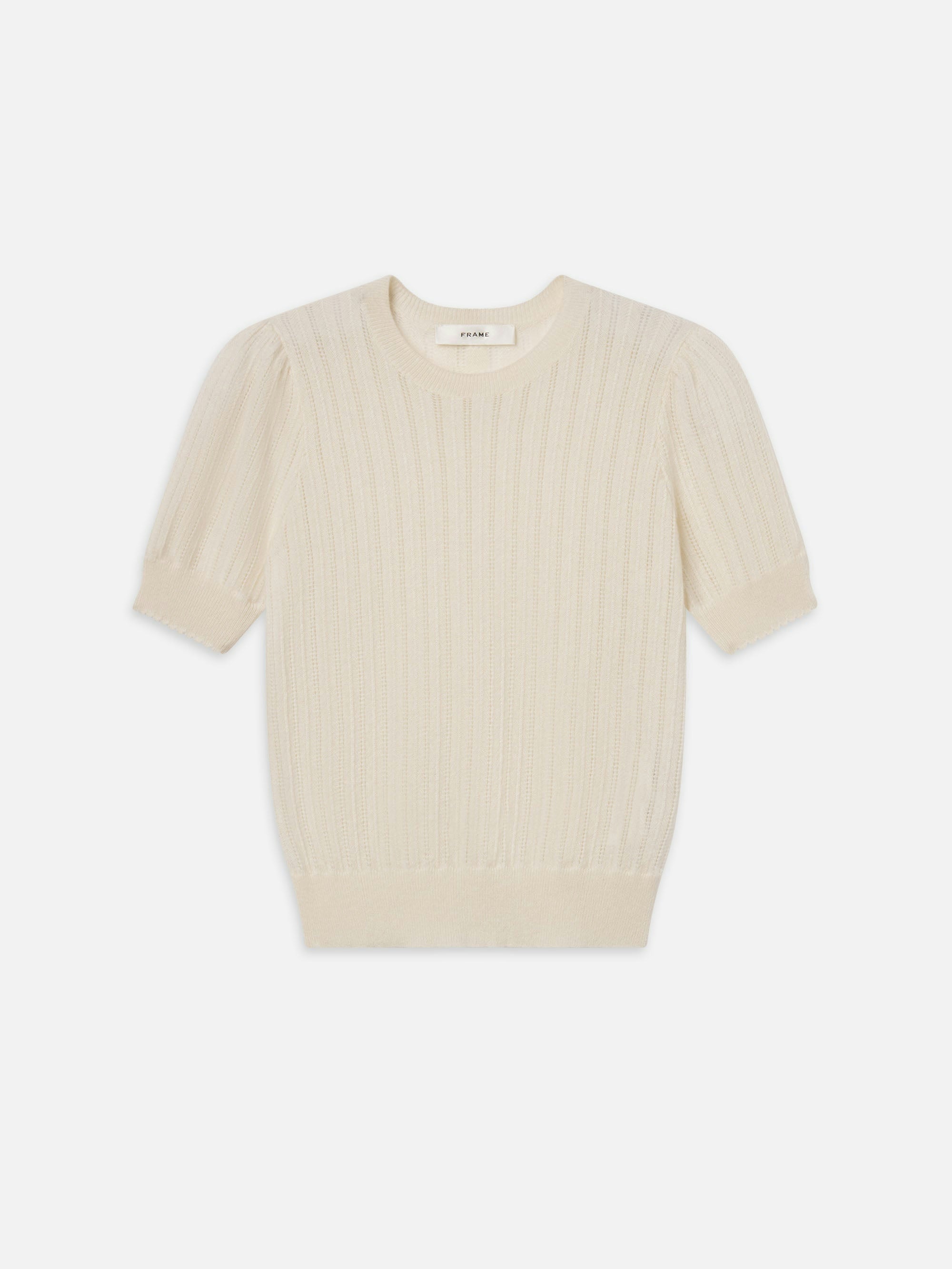 A featherlight cashmere knit accented with delicate ladder pointelle stitching. Finished with softly scalloped edges that add an easy, feminine touch.