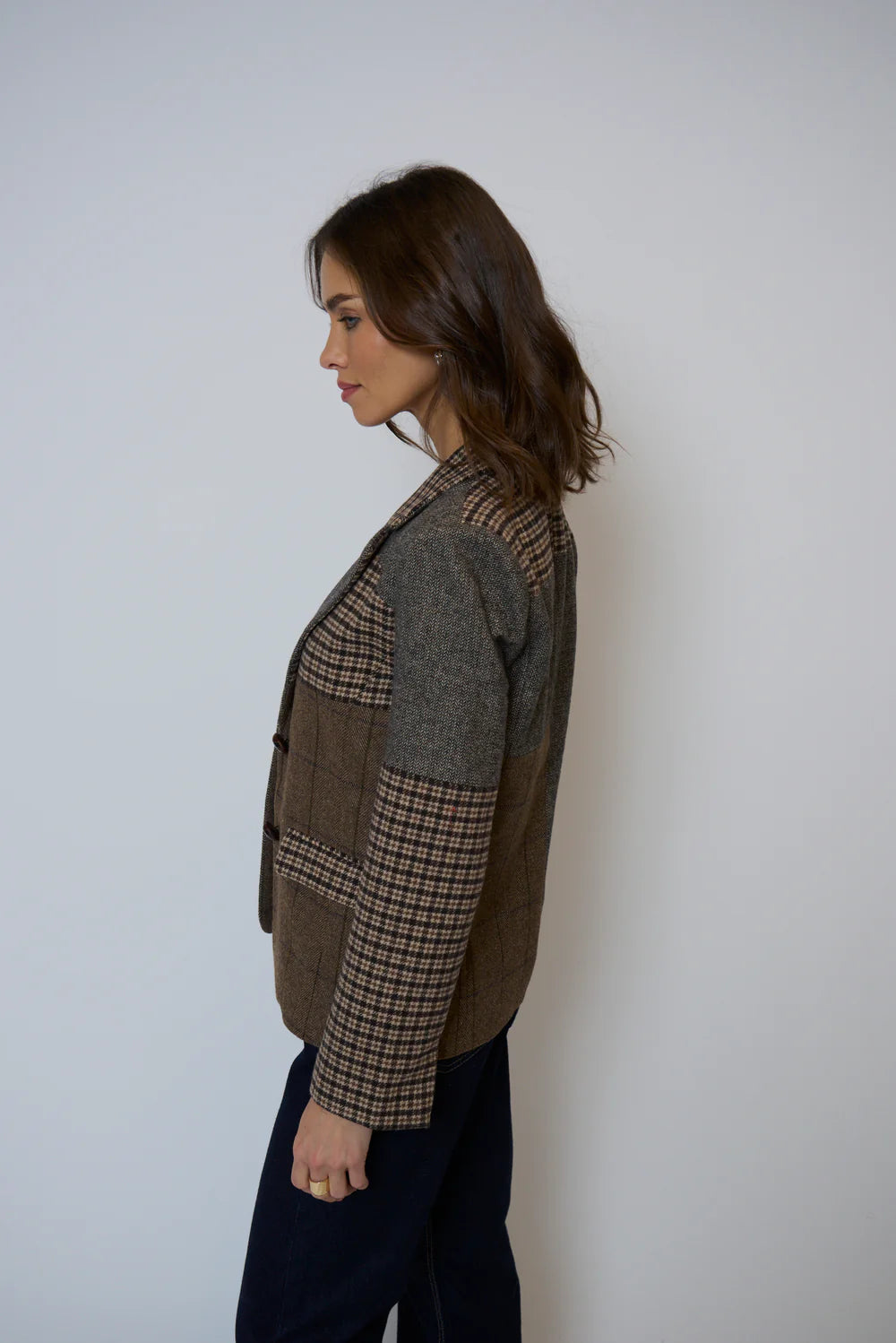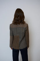 Tailored jacket with subtle waist shaping and lightly structured shoulders for a sharp silhouette. Detailed with a patchwork design that blends multiple classic patterns, finished with a button closure and welt-style front pockets.