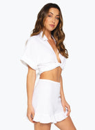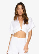The Chiara Top is a sultry spin on the classic button-down. Crafted from lightweight linen, it features a fold-over collar that plunges into a deep V-neck, twisting at the back into a striking knot closure. The oversized elbow-length sleeves add a modern finish, making it easy to elevate with the Carina Maxi or keep it casual with your favorite everyday bottoms.