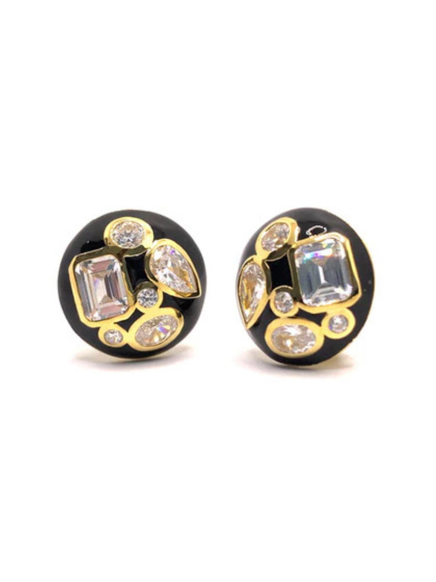 Multi-Shape Black Enamel Round Button Clip on Earrings