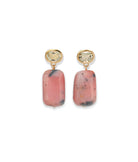 These earrings strike the perfect balance of earthy and elegant with faceted green amethyst tops and speckled pink opal drops set in gold-plated brass. Each natural pink opal varies in color and pattern, giving every pair a unique, one-of-a-kind finish.