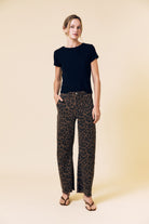 The Utility Soft Barrel Jean features a relaxed wide-straight leg with a subtle curved outseam for a modern, sculpted look. Crafted from comfort-stretch denim in a dark leopard wash, it combines utility-inspired design with a bold, fashion-forward edge.