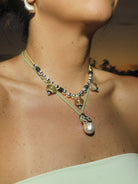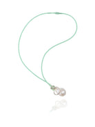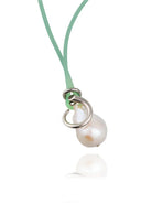 Our Seaside Souvenir necklaces blend high and low elements with effortless charm. An elegant freshwater pearl is embraced by a sculptural wave crafted from rhodium-plated brass. The pendant hangs playfully from bikini-hued rubber cording, perfectly capturing the carefree spirit of summer.