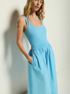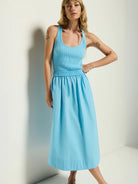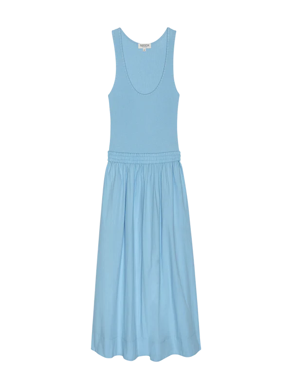 Crafted from a mix of two fabrics, the Sadelle Dress blends comfort and confidence with ease. It features a ribbed cotton scoop-neck bodice paired with a gathered midi-length cotton poplin skirt for a look that’s effortlessly authentic. Shown here in Day Dream.