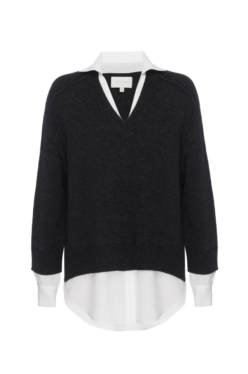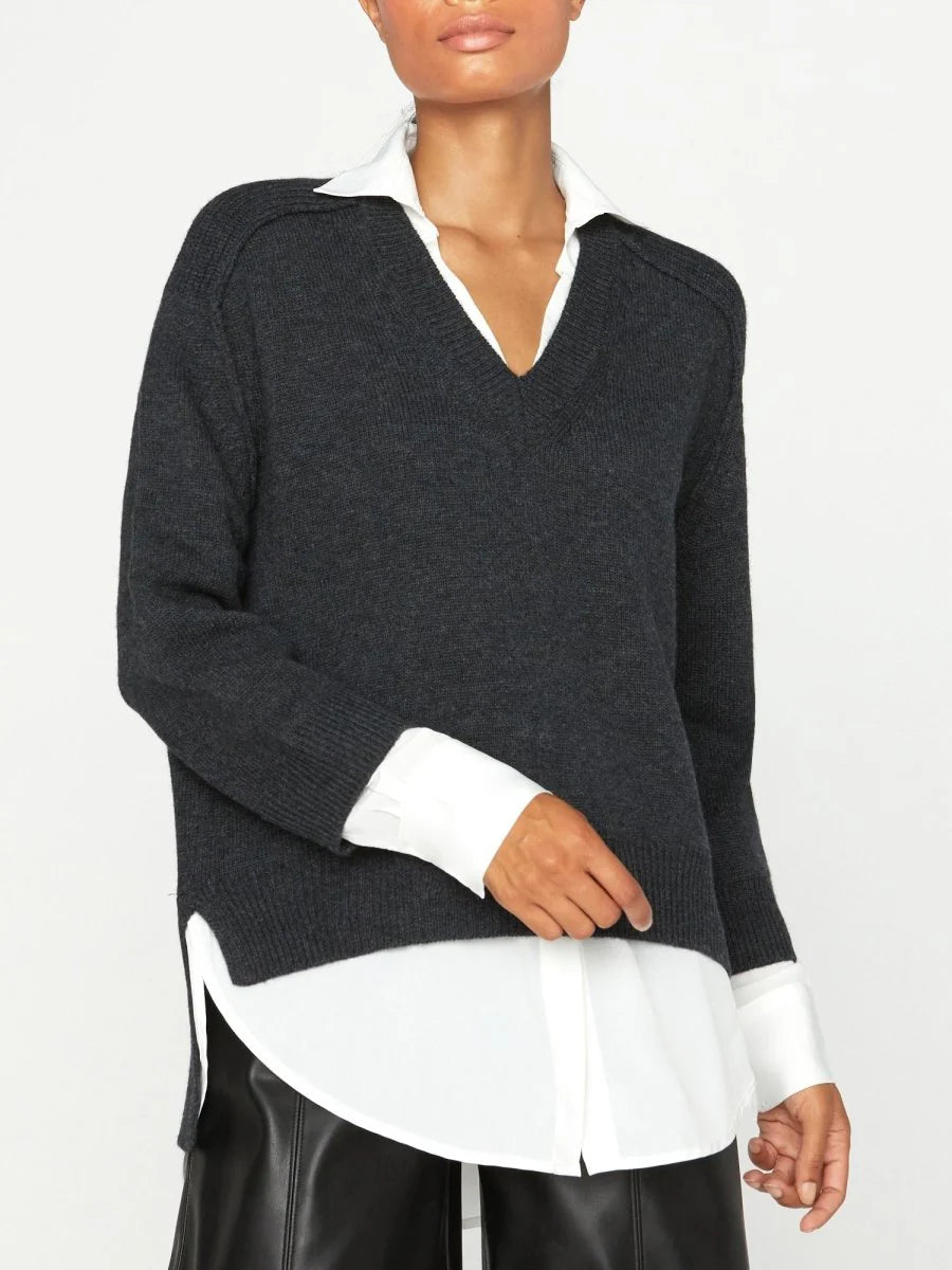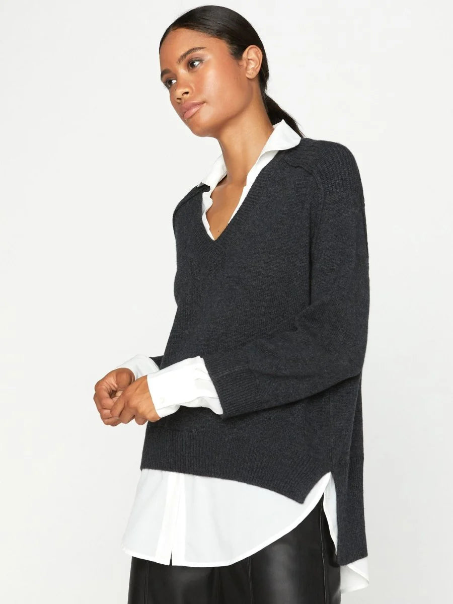 The Looker Layered V Neck in Dark Charcoal w/ White