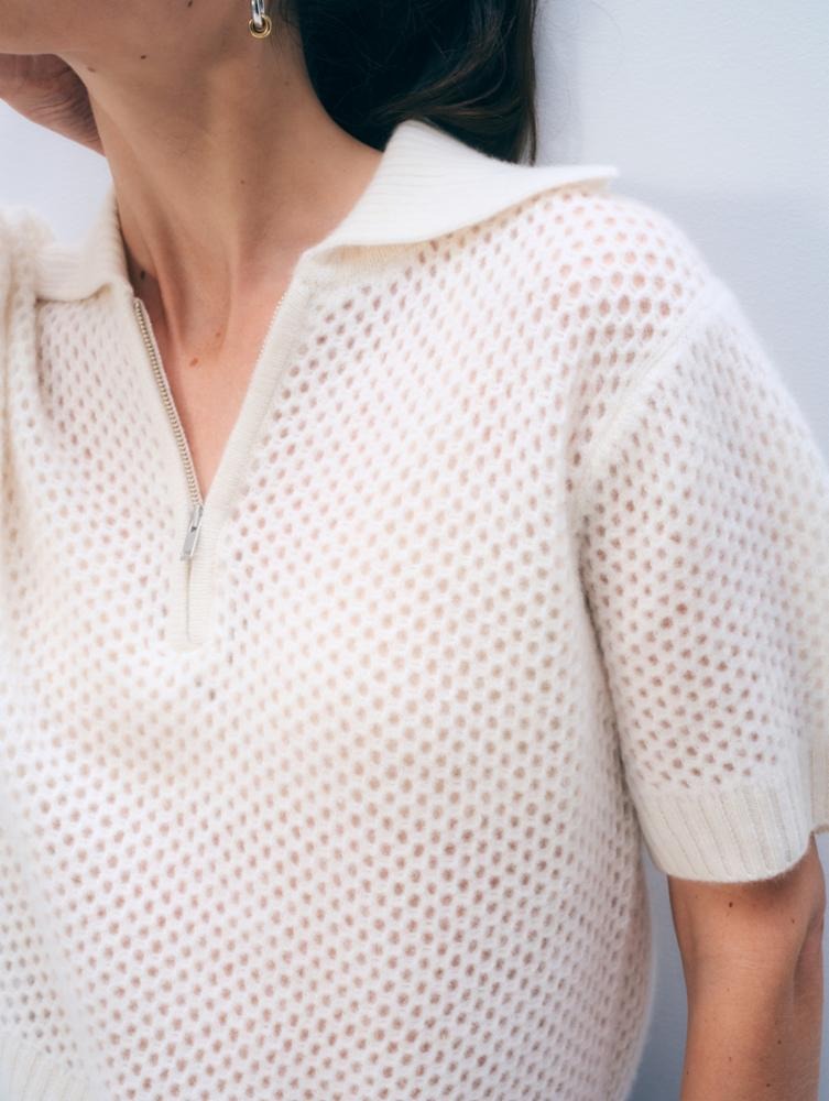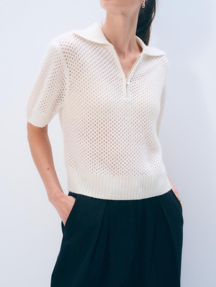 A modern twist on a classic polo, this cashmere mesh top blends effortless style with airy sophistication. Crafted from soft, lightweight cashmere in an open mesh knit, it features a relaxed silhouette with short sleeves and a zip-front polo collar for a sporty, refined finish. Easy to layer or wear on its own, it brings breathable comfort and understated luxury to everyday dressing.