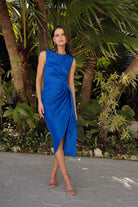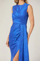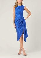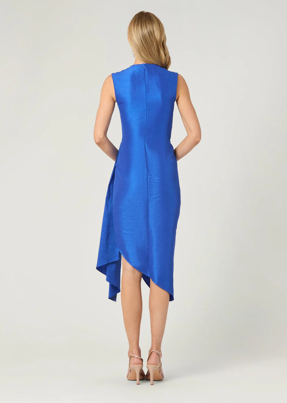 Sleek and sophisticated, this modern stretch taffeta cocktail dress is a statement piece. It features a round neckline and sleeveless bodice, with elegant draping details on the top and front skirt. The asymmetrical high-low hem adds drama, while a cascading sash at the side enhances the look. The bodice is lined for a smooth fit, while the skirt remains unlined for a light, airy feel. Finished with a hidden back zipper.