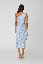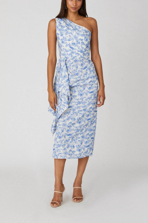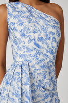 Beautiful one-shoulder cocktail dress in blue and white print taffeta. Simple and clean column silhouette with side skirt cascade. Boning construction inside. Fully lined. Hidden side zipper.