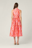 Elegant and feminine, this cocktail dress is crafted from a floral jacquard fabric. It features a wide sweetheart neckline and a structured, sleeveless bodice with internal boning for a flattering fit. The form-fitting top flows into a voluminous, shirred skirt for a dramatic silhouette. Bodice is fully lined; skirt is unlined. Finished with a hidden back zipper for a seamless look.