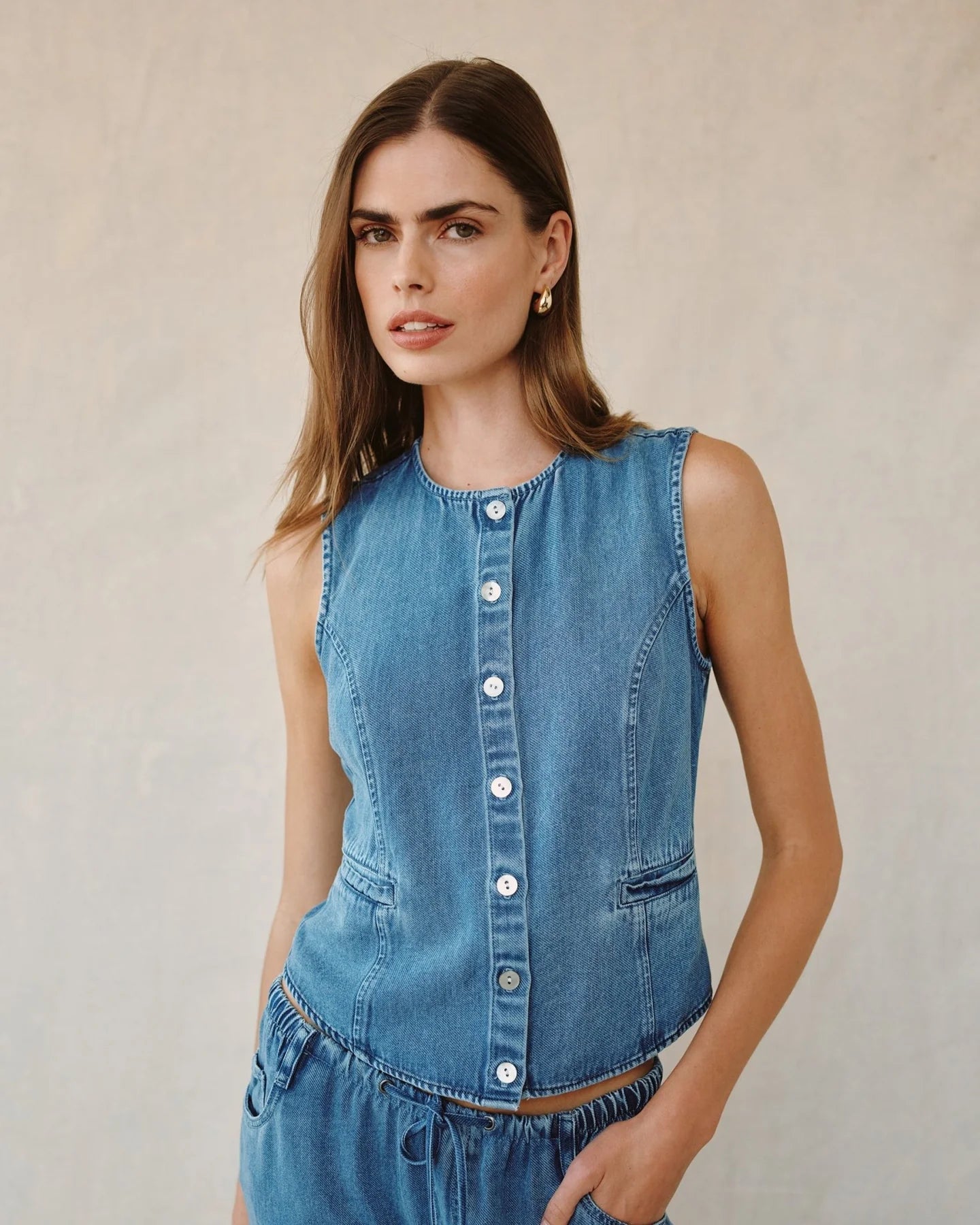 High Neck Fitted Vest in Medium Vintage Wash