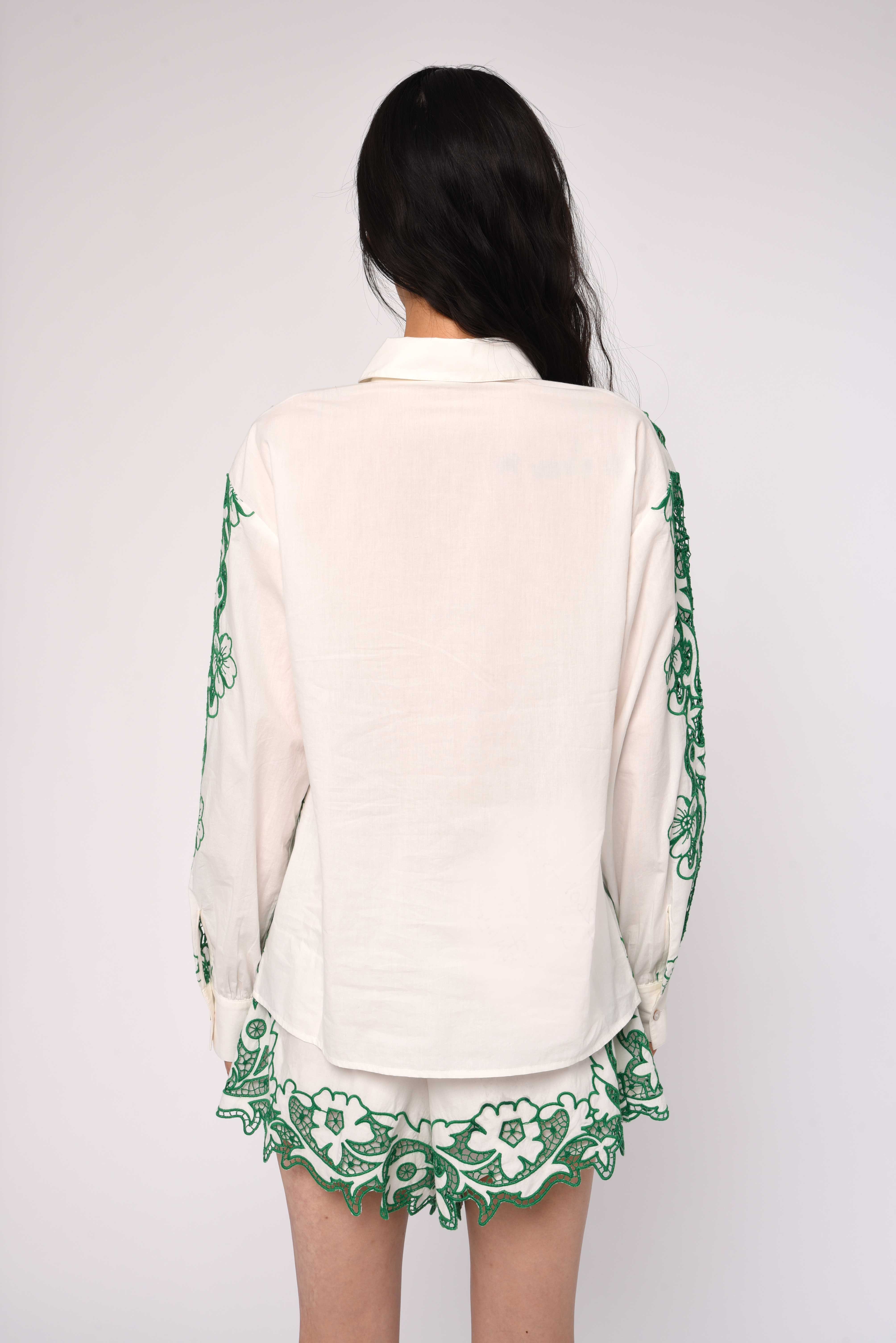 Set against a crisp ivory base, bold green embroidered-inspired florals and scrollwork create striking contrast and vertical lines that elongate the shape. The tailored fit and clean cuffs keep the look sharp, while the ornate pattern adds depth and visual interest. Styled on its own or paired with the coordinating shorts, this top delivers effortless sophistication with a fresh, modern edge.