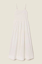 The Carmen Dress is a stunning new full-length silhouette that balances delicate details with effortless drama. Crafted from crisp cotton poplin in classic White, it features adjustable 'barely there' straps with vintage metal rings and sliders for a customizable fit. A shaped drawstring waist creates a flattering silhouette, giving way to soft gathers and a midi-length hem. Lined for comfort and finished with hidden side seam pockets, this dress is equal parts functional and feminine—perfect for warm-weather days or elevated evenings.