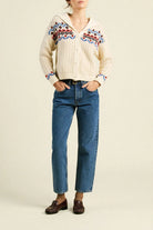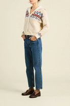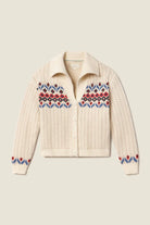 The Savannah Cardigan features a rich basket weave texture in antique white, accented by a contrasting cream sailor collar and cuffs for a timeless, nautical touch. Finished with our signature gold owl buttons for a hint of charm. Shown here in Antique White Fairisle and crafted from soft, cozy merino wool.