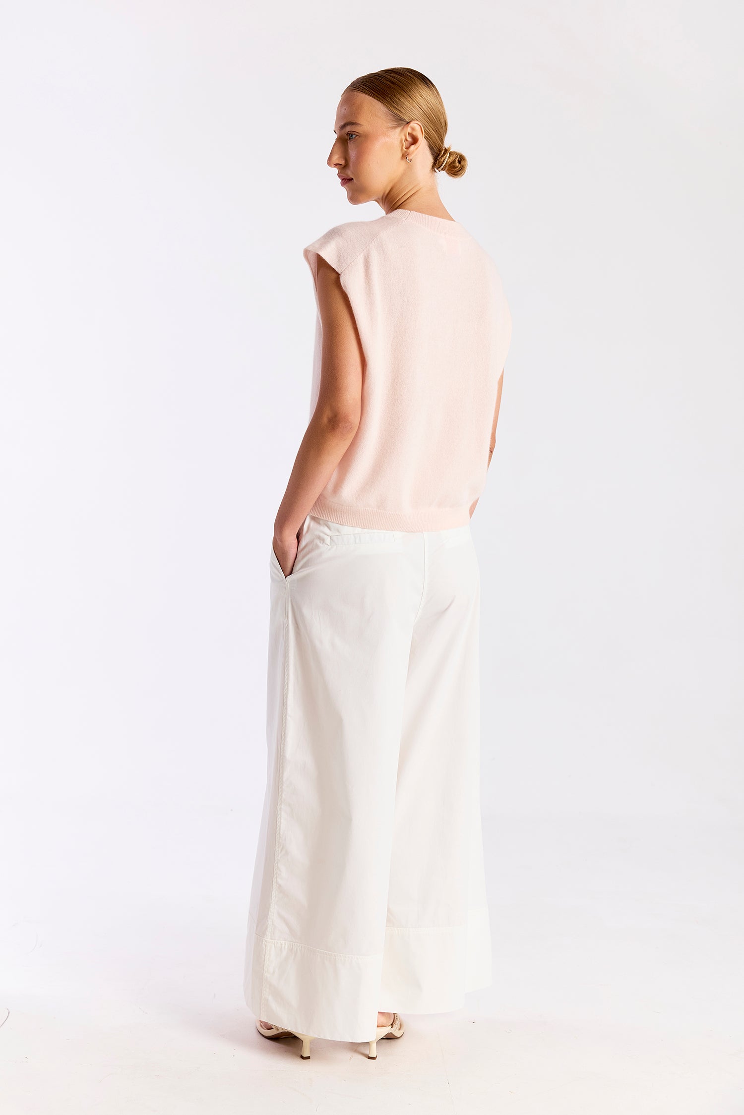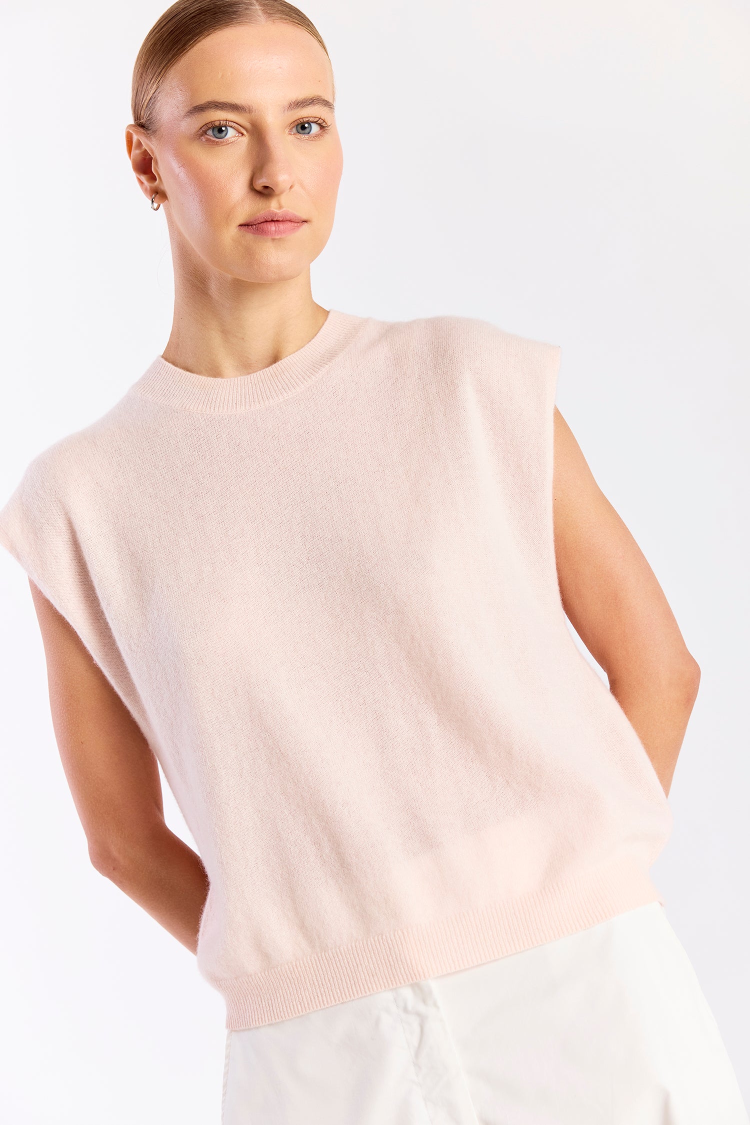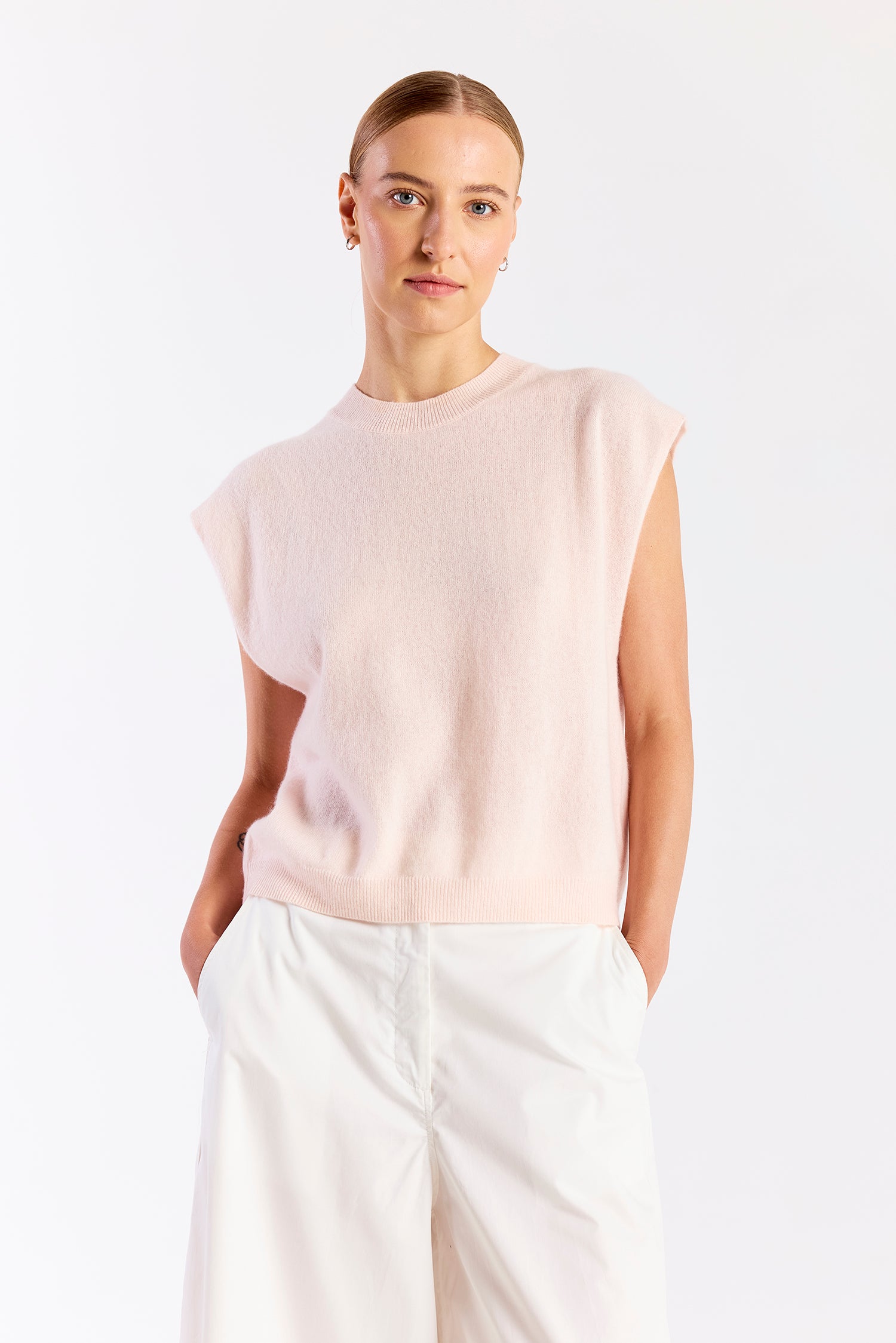 The Tina Tank is a modern knit essential designed with clean lines and an effortless silhouette. Featuring a classic crew neckline and softly structured cap sleeves, this sleeveless sweater offers a relaxed fit that drapes beautifully without feeling oversized. The lightweight knit provides a smooth, refined finish, making it easy to style tucked into tailored trousers or worn loose with denim. Simple yet polished, it’s a versatile piece that transitions seamlessly from casual to elevated looks.