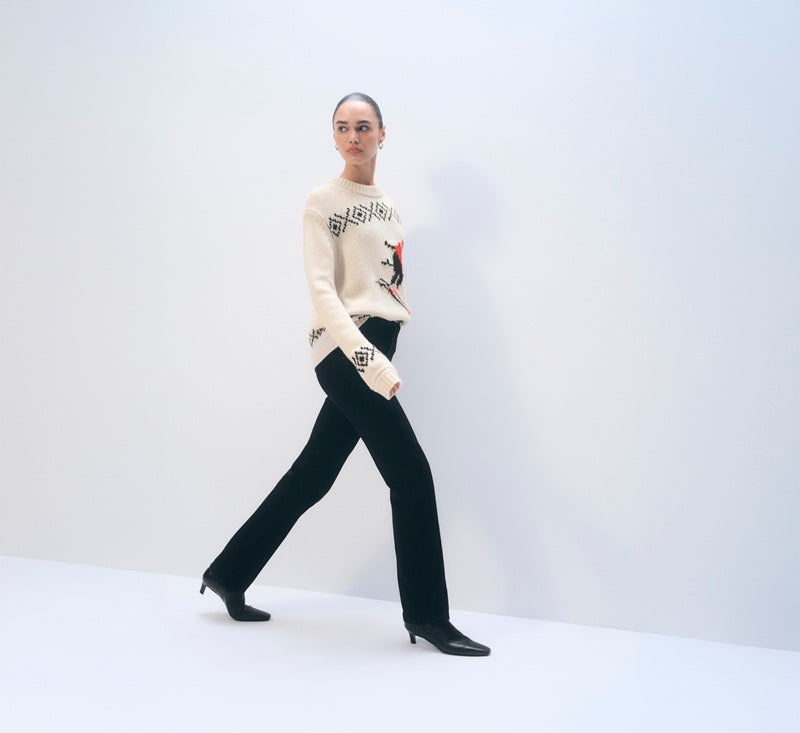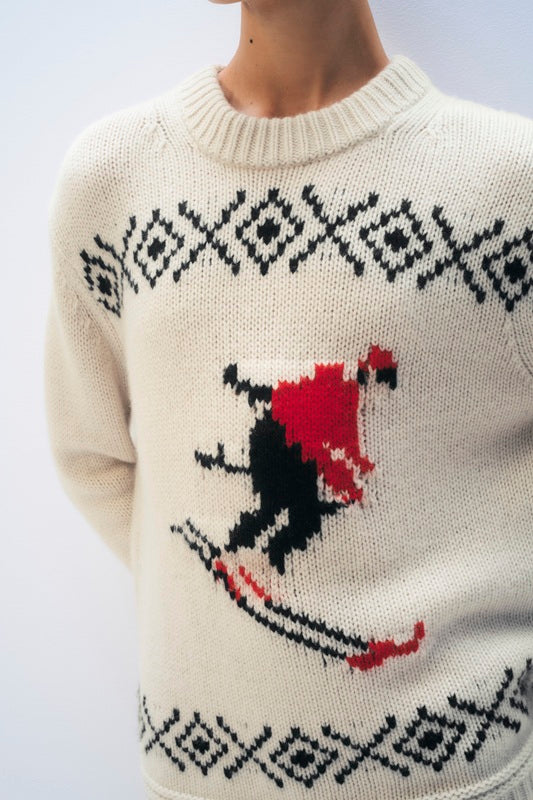 This sweater is the perfect blend of vintage ski nostalgia and modern ease. Knit in a soft, chunky texture with an ivory base, it features a retro skier motif at the center and Fair Isle-inspired patterning across the chest and cuffs. The relaxed, slightly slouchy silhouette, ribbed crew neckline, and long sleeves give it that effortless, cozy feel. Whether styled with denim for everyday wear or layered for après-ski, it brings a playful yet timeless alpine charm to your winter wardrobe.