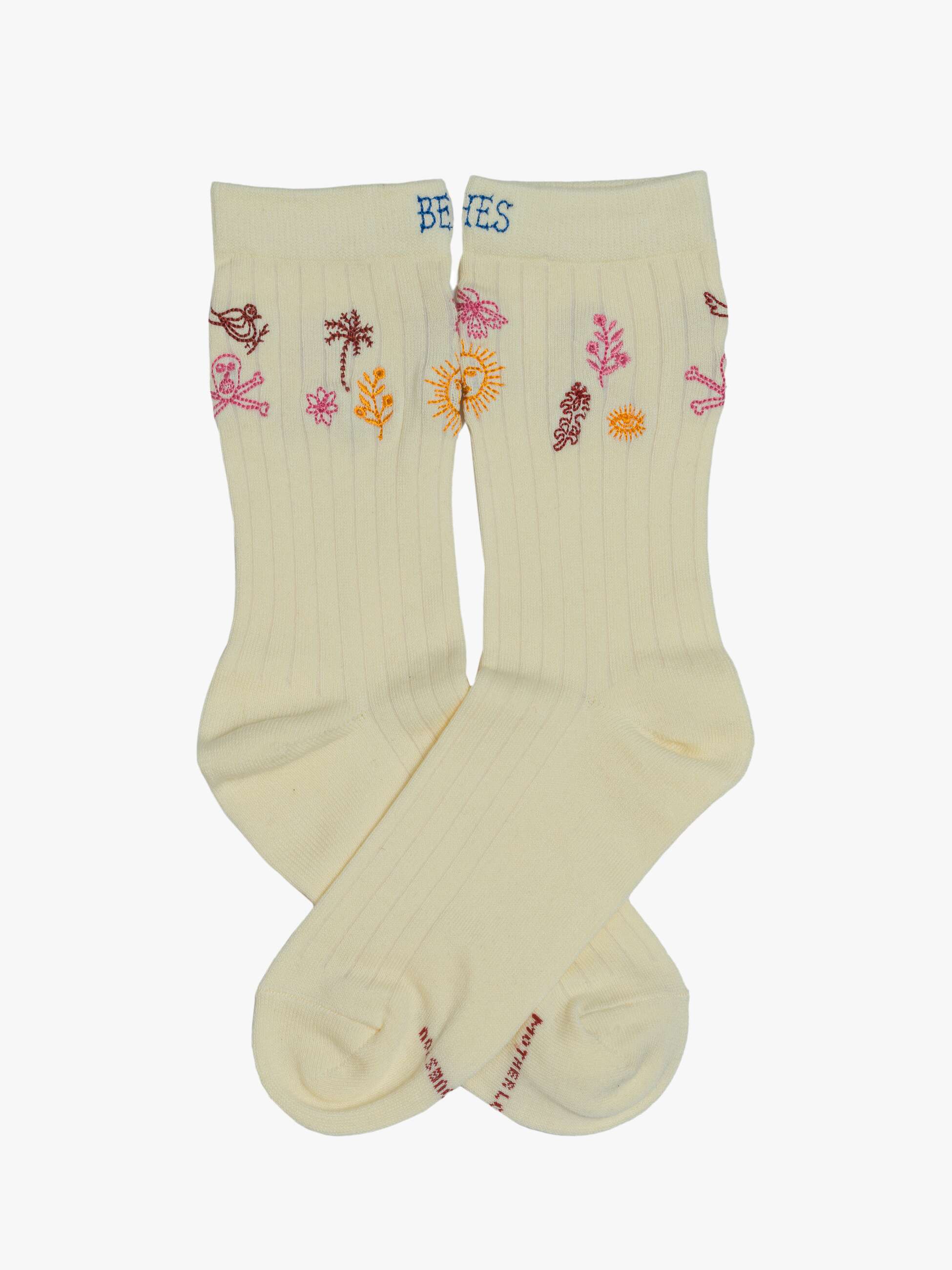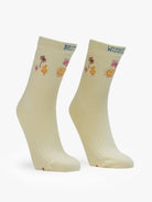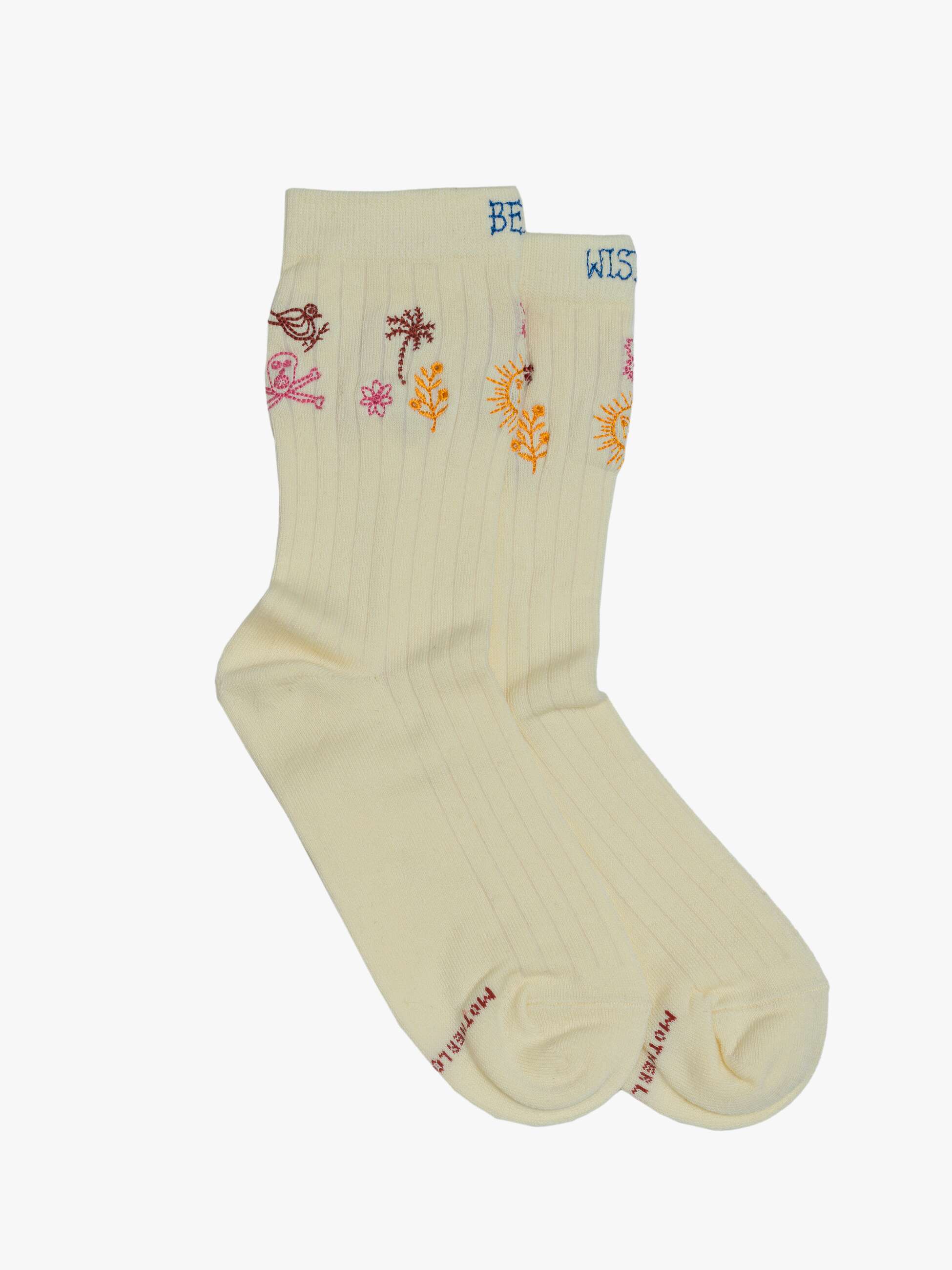 Best wishes, from MOTHER. These playful tube socks feature a pale yellow base with blue text and warm-toned graphics for a cheerful pop. A fun, feel-good addition to any laid-back look.