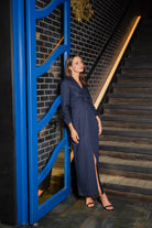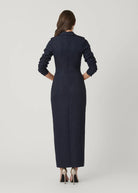 A modern take on evening tailoring, this tuxedo dress is crafted in crystal-embellished twill for subtle sparkle. The collared V-neckline with a scrunched hem and twisted drape detail adds dimension to the fitted bodice, while long sleeves keep the look refined. A straight column skirt with a front slit balances structure and movement, finished with full lining and a hidden back zip for a sleek fit.