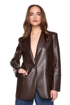 A sleek update to a classic layer, this faux-leather blazer is cut in a timeless single-breasted silhouette with a sharp tailored fit. Designed with notched lapels, front flap pockets, and a single button closure, it’s polished yet modern. The rich chocolate-brown finish adds a sophisticated edge, making it a versatile piece to wear with denim by day or dressed up at night.