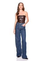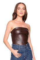 Sleek and minimal, this faux-leather tube top makes a bold statement with its clean, strapless silhouette. Designed to hug the body with a smooth finish, it’s a versatile style that pairs effortlessly with denim, tailored trousers, or layered under a blazer. A modern essential for nights out or polished layering.