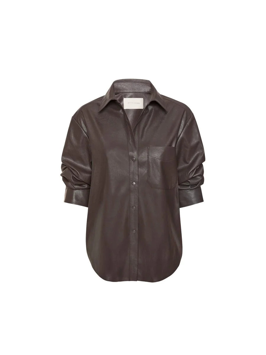The newest addition to our Essential Shirt Collection, the Pia Shirt features our signature pre-styled scrunched sleeve—now reimagined in sleek vegan leather. A modern twist on a classic silhouette, it adds instant edge with zero effort.