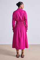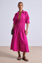 Made from 100% organic cotton, this effortlessly chic dress is a seasonal must-have. Designed with classic shirting details, it features a crisp collar, front button placket, and a flattering smocked waist for a defined yet comfortable fit. The soft A-line silhouette and dropped shoulders add to its relaxed elegance.